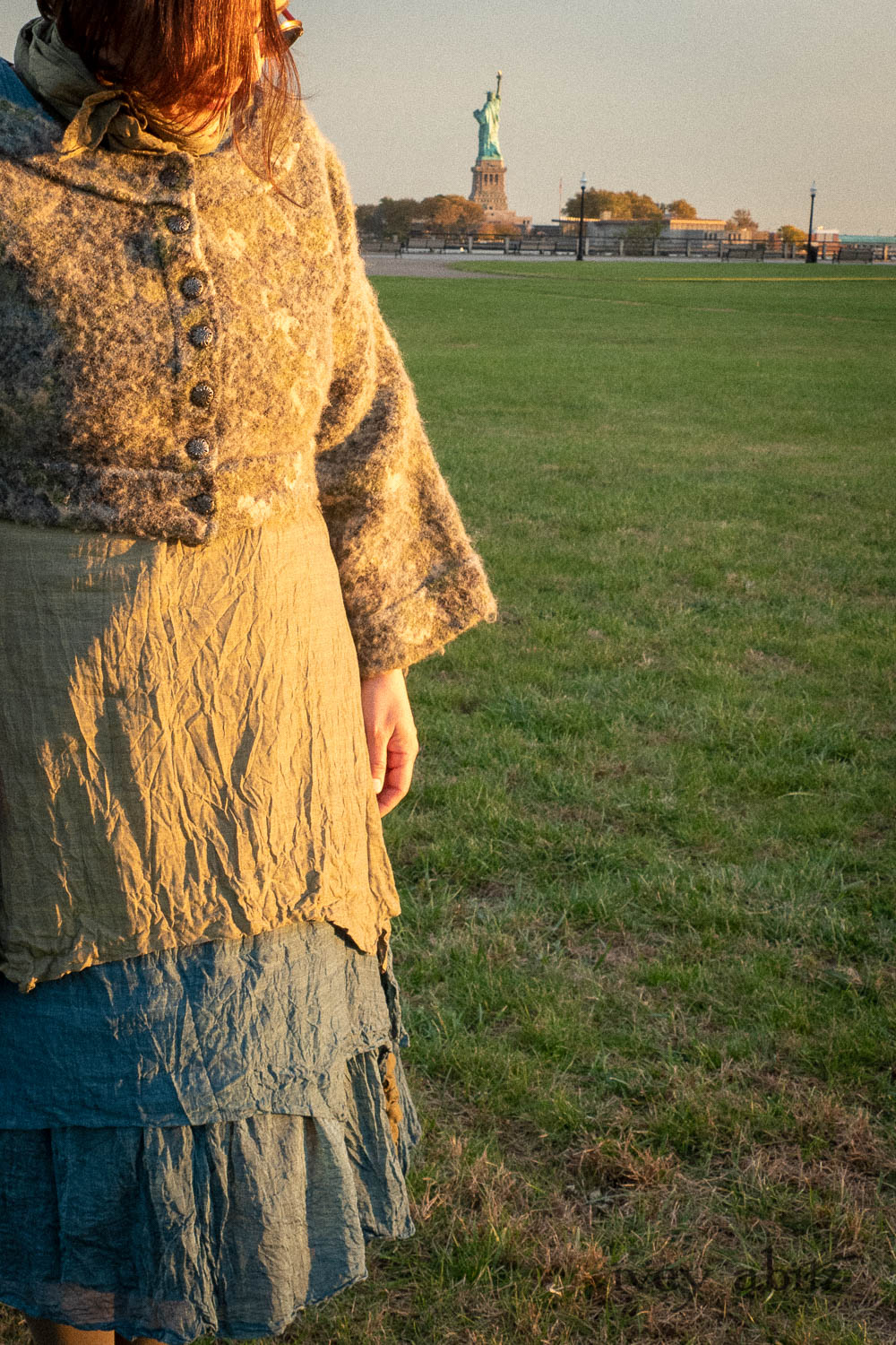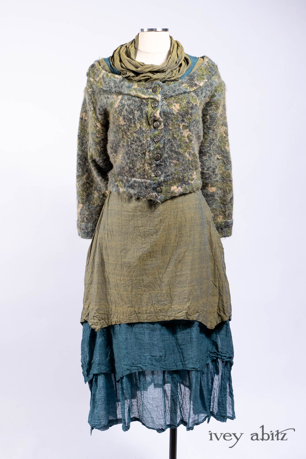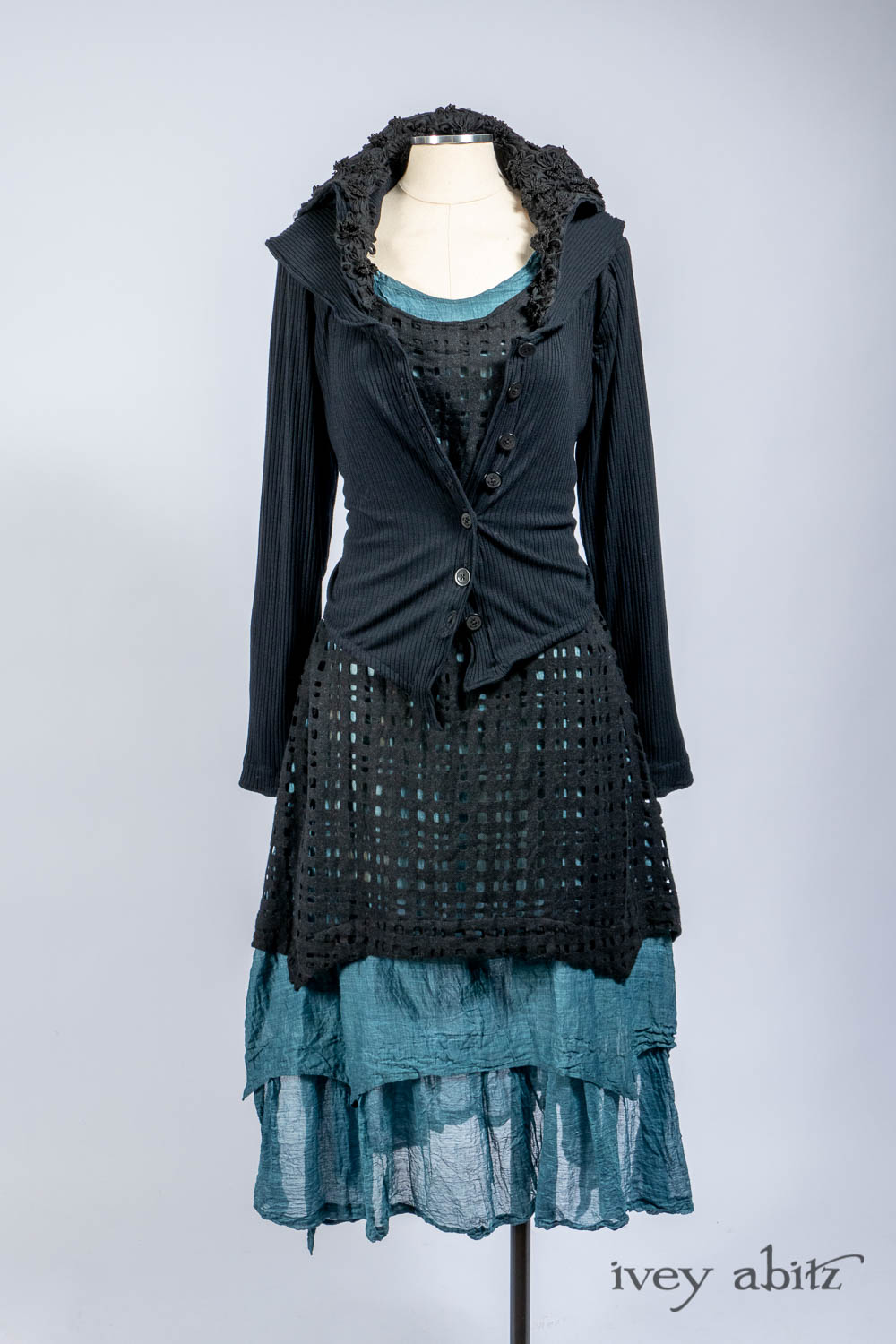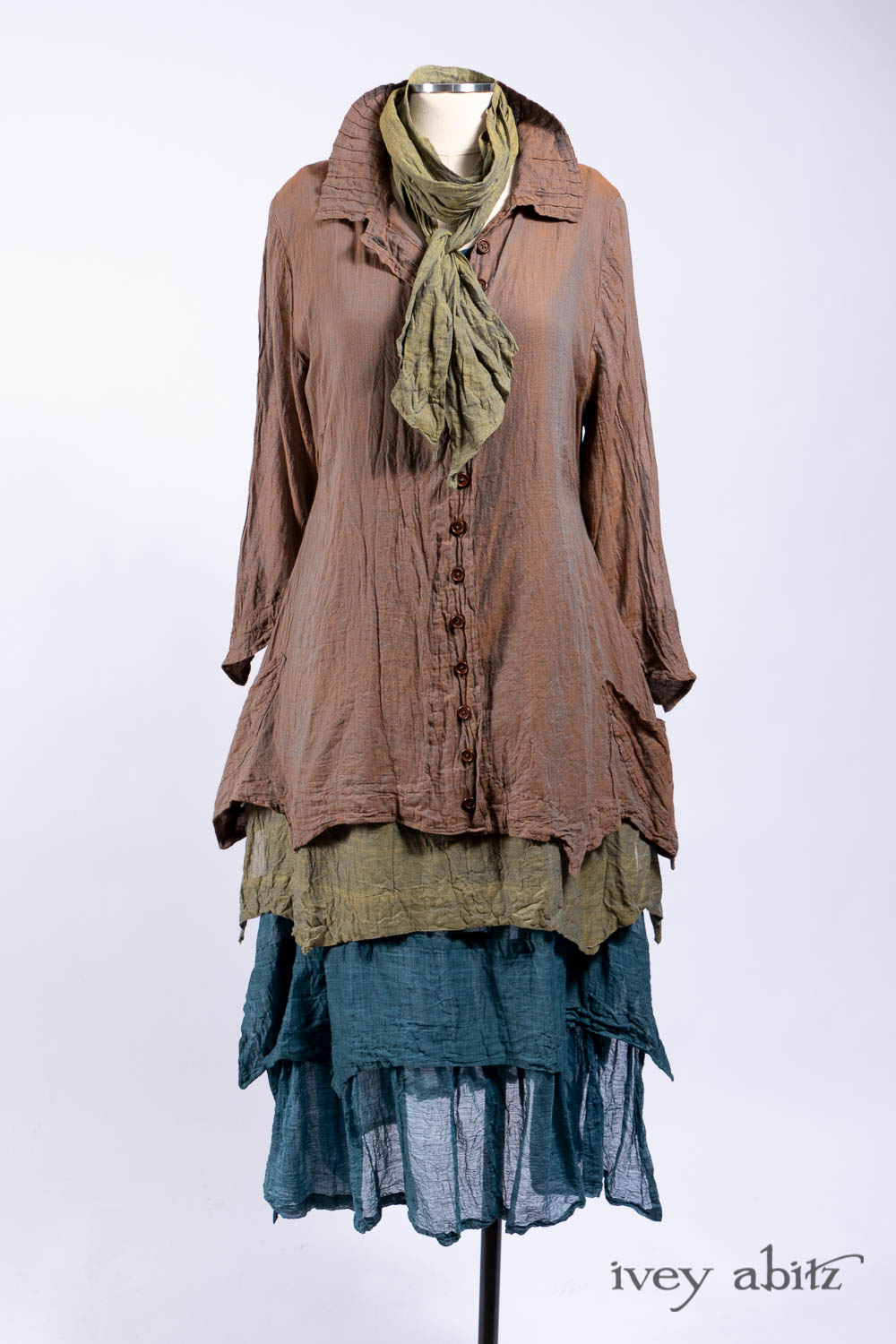 The Liberté Frock is meant to be worn with the other designs in the Liberté, Ellis, and Bartholdi collections. The Bedloe Frock is its companion layering piece. Because it has such relevant design details that echo many other design collections here at Ivey Abitz, it can be mixed and matched with so many things. The Camille Frock, for example. The Chittister designs. All of our shorter jackets like the Eugenia. The list goes on and on…