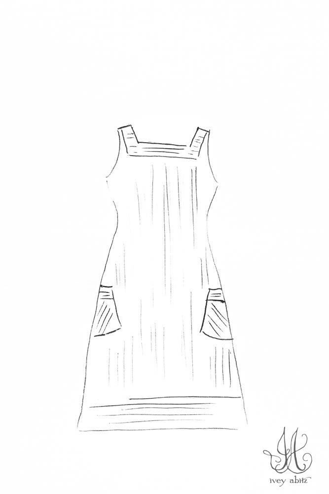 • Square neckline echoes the lines in the generous pockets and the bottom hem. They all call on one another to sing in harmony.