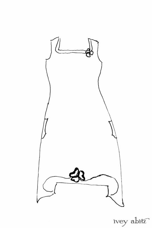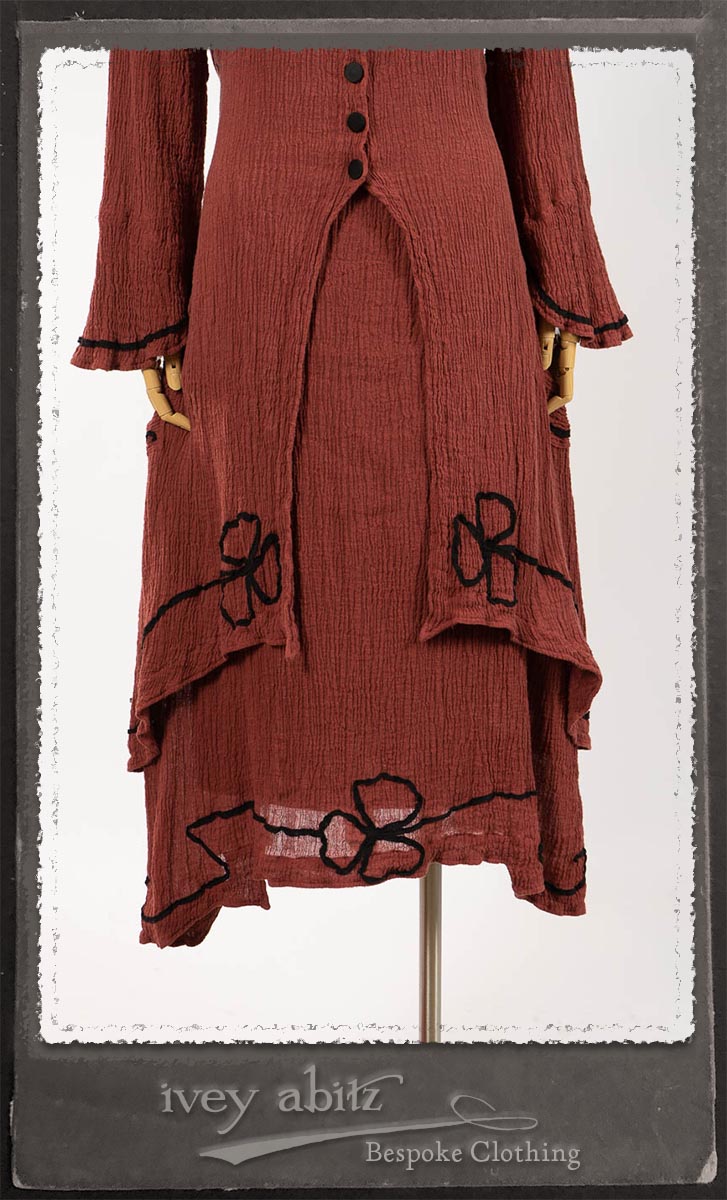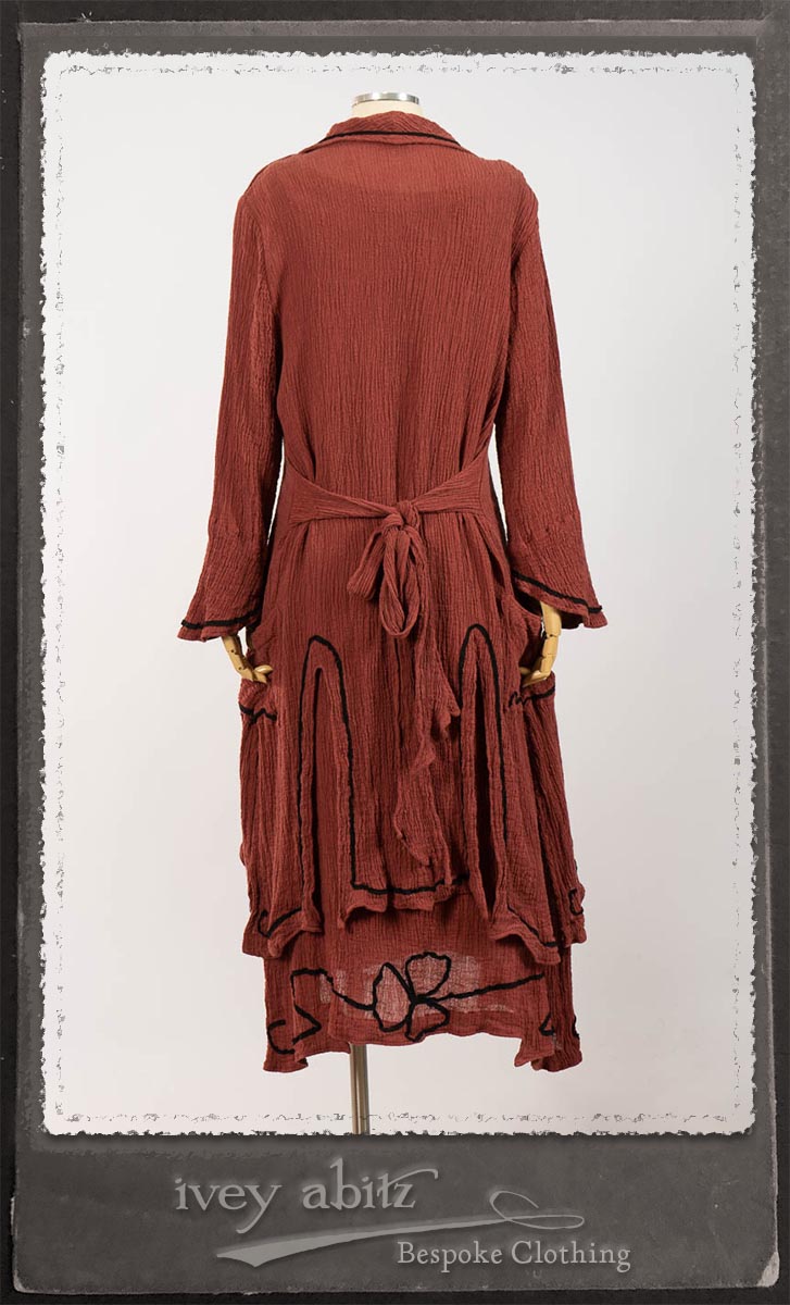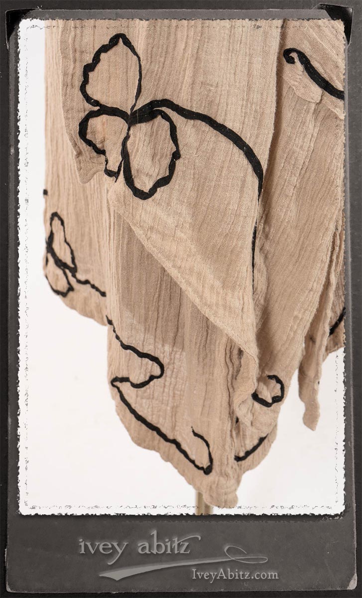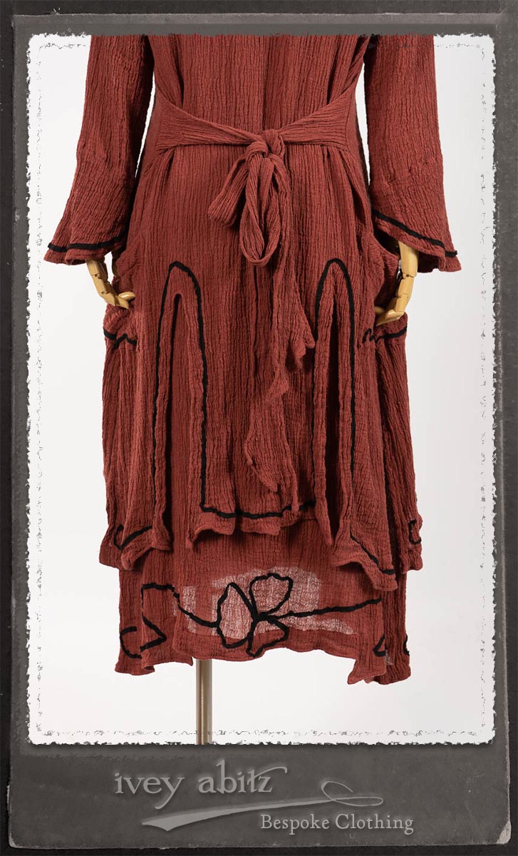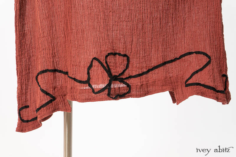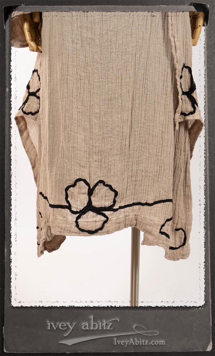 • Sturdy twill ribbon is artfully sewn onto the frock, creating lyrical lines and pleasing floral embellishments. Each one is slightly different, creating a one-of-a-kind garment.