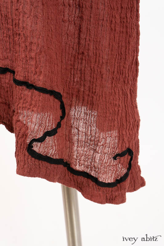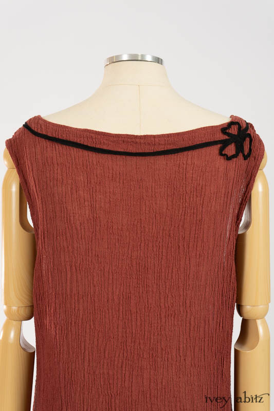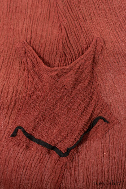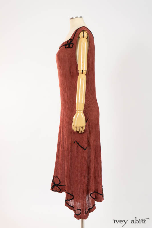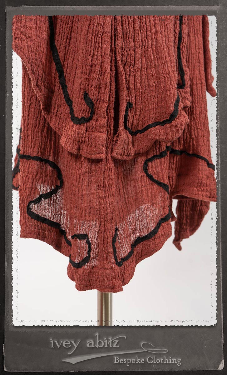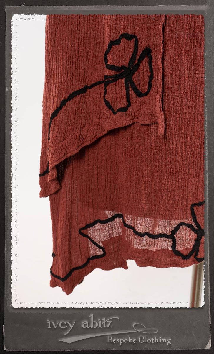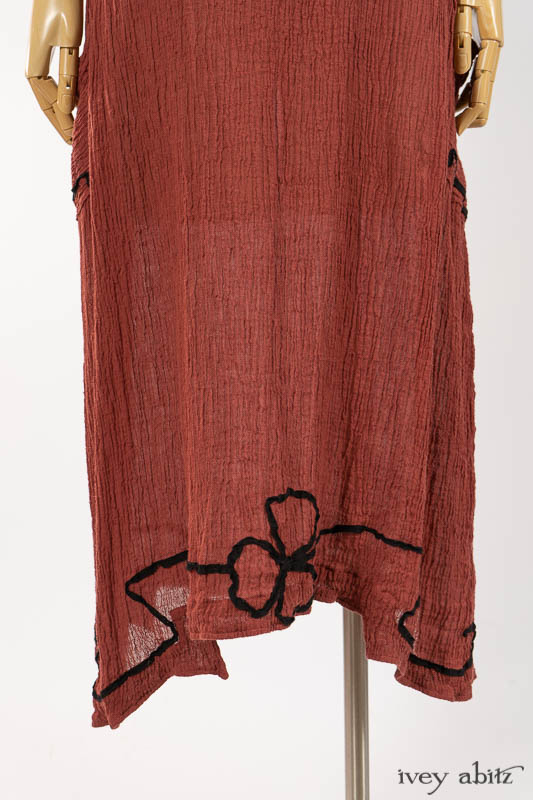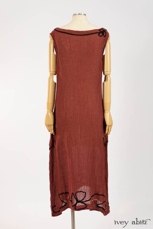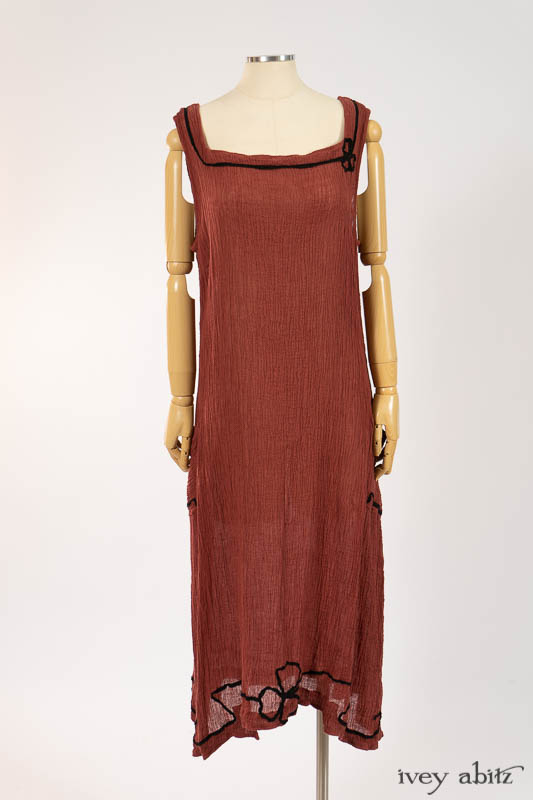 • Sturdy twill ribbon is artfully sewn onto the frock, creating lyrical lines and pleasing floral embellishments. Each one is slightly different, creating a one-of-a-kind garment.