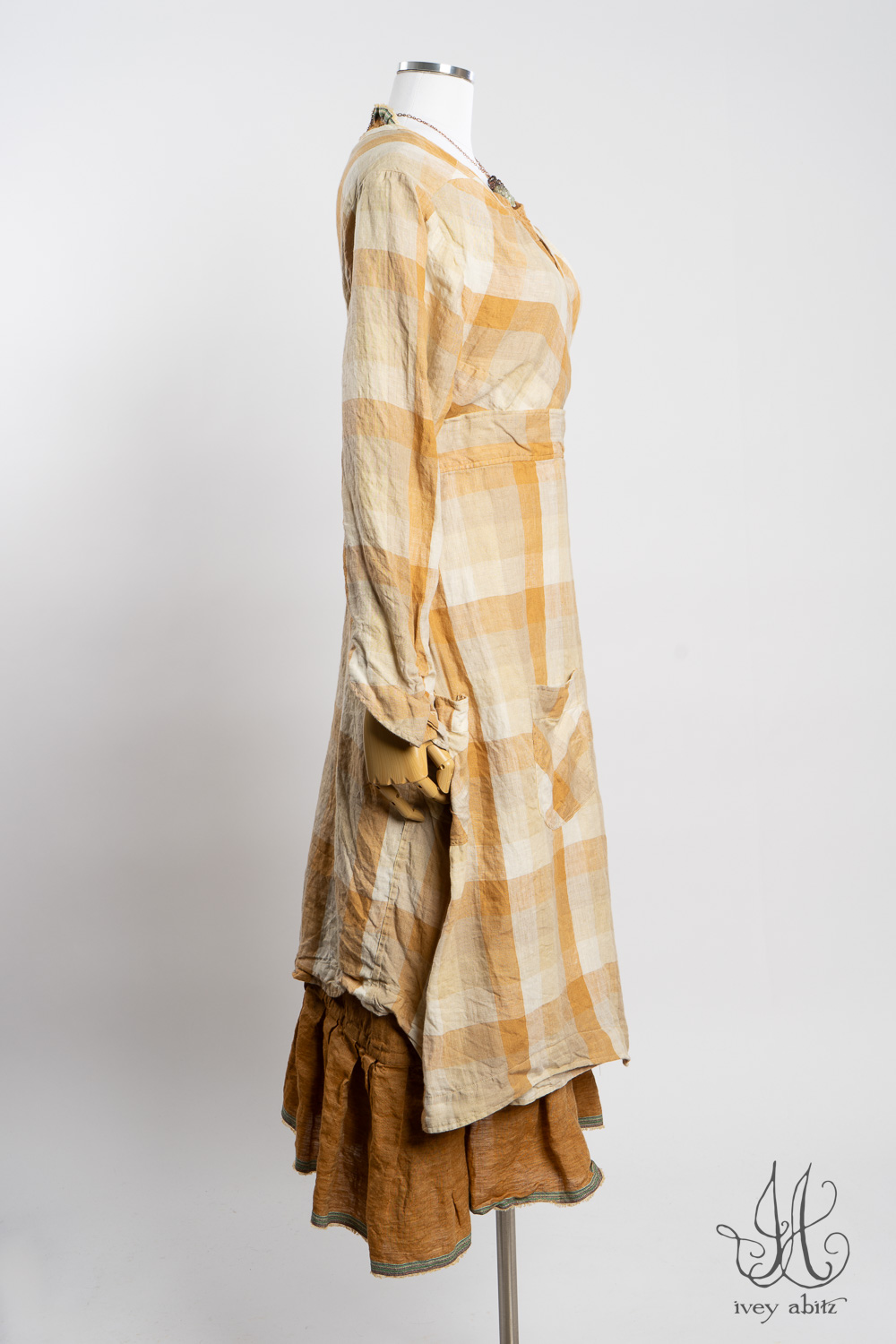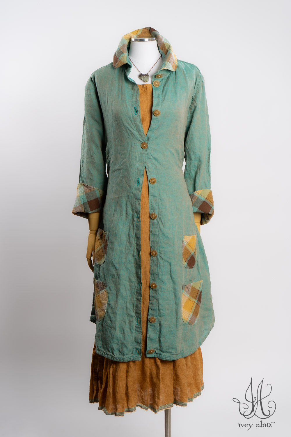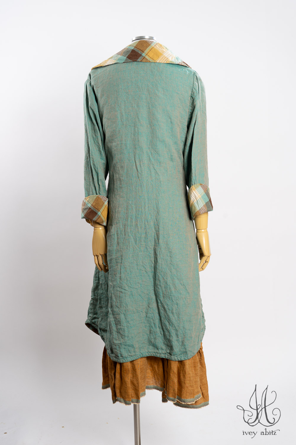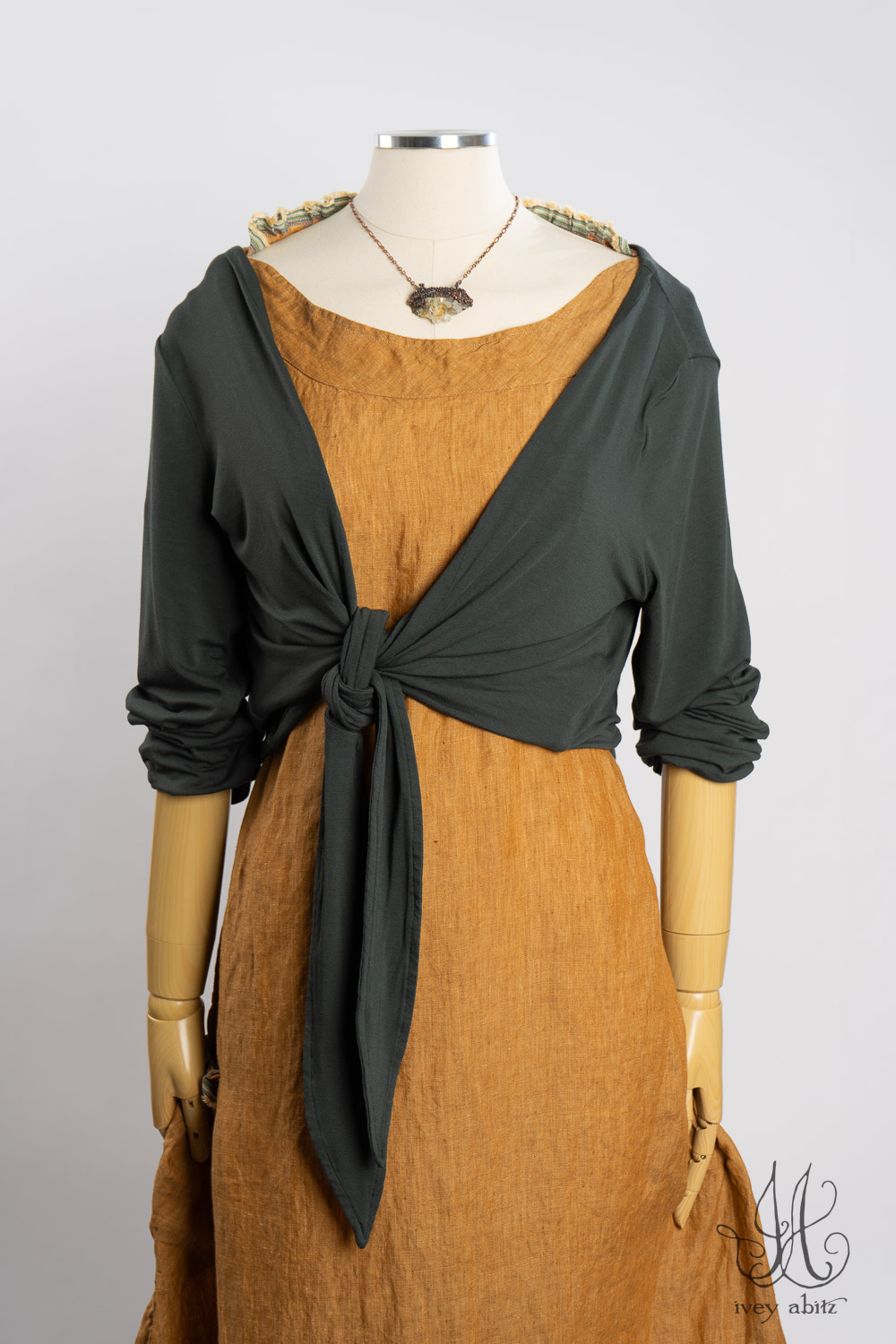 The Rennie Frock can mix and match with pretty much any Ivey Abitz design. The Rennie works especially well with shirts and duster coats that have a straight bottom hem. This echoes the straight line that is created at the top and bottom of the meticulously placed subtle pleating along the bottom hem.Â
