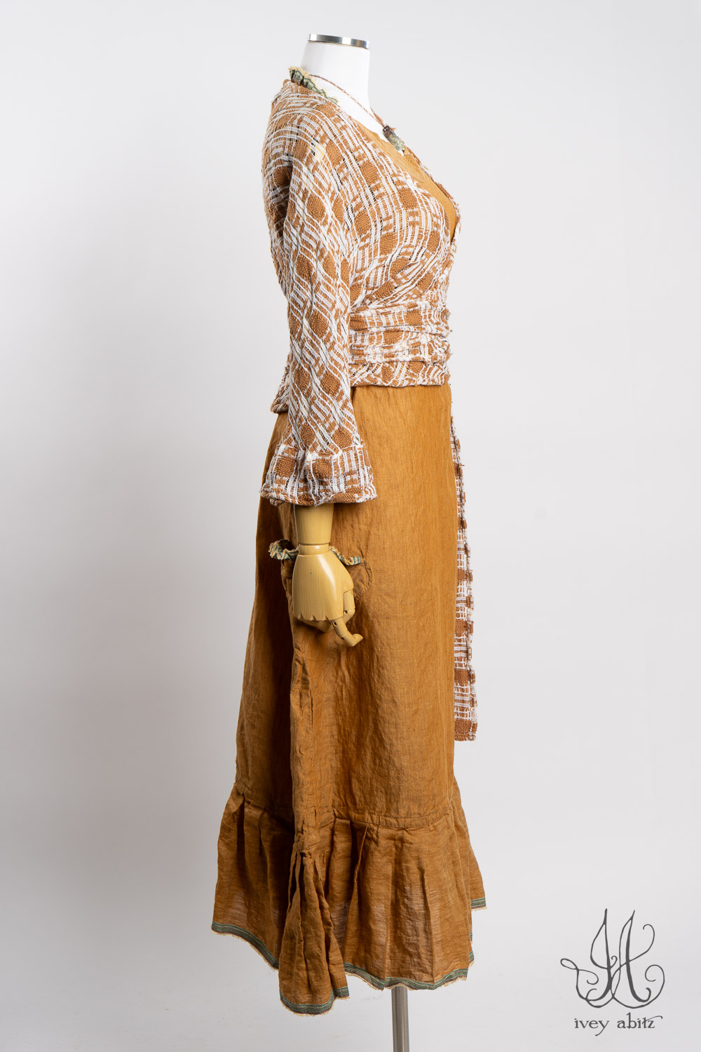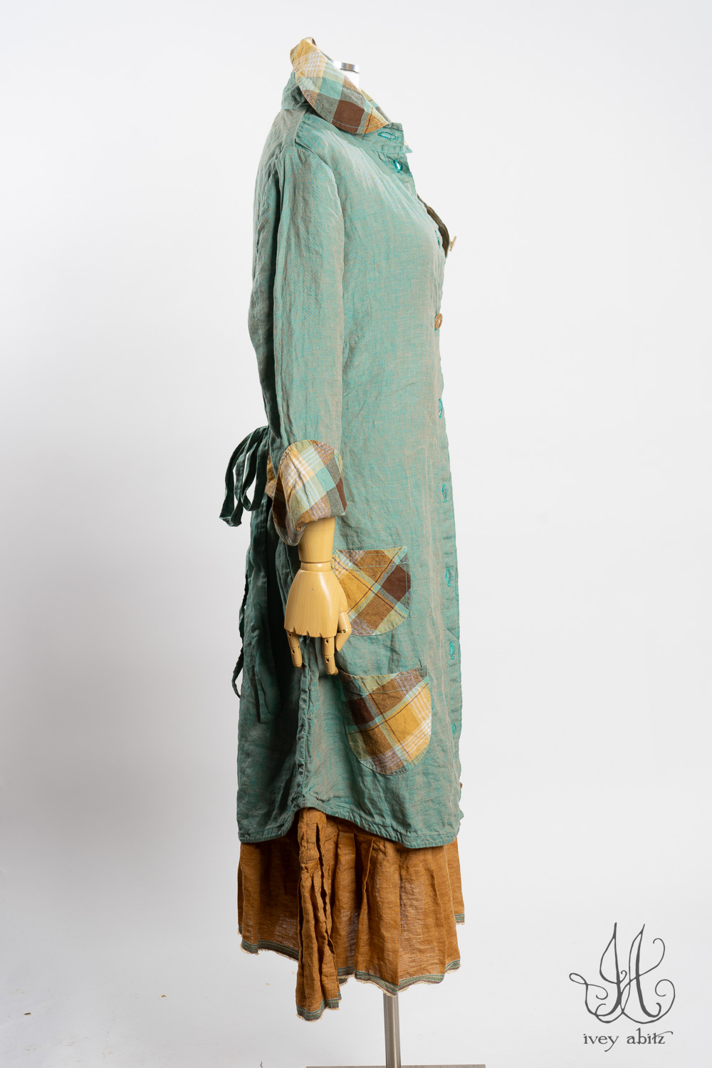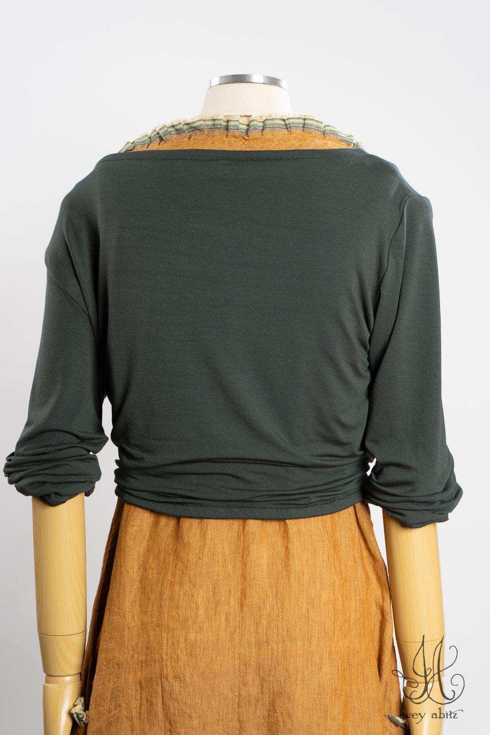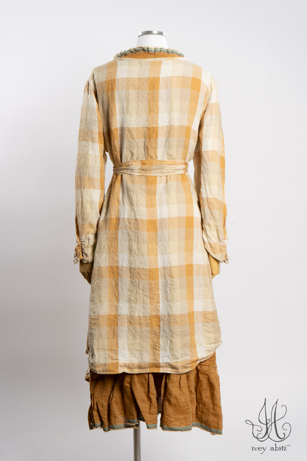 The Rennie Frock can mix and match with pretty much any Ivey Abitz design. The Rennie works especially well with shirts and duster coats that have a straight bottom hem. This echoes the straight line that is created at the top and bottom of the meticulously placed subtle pleating along the bottom hem.Â