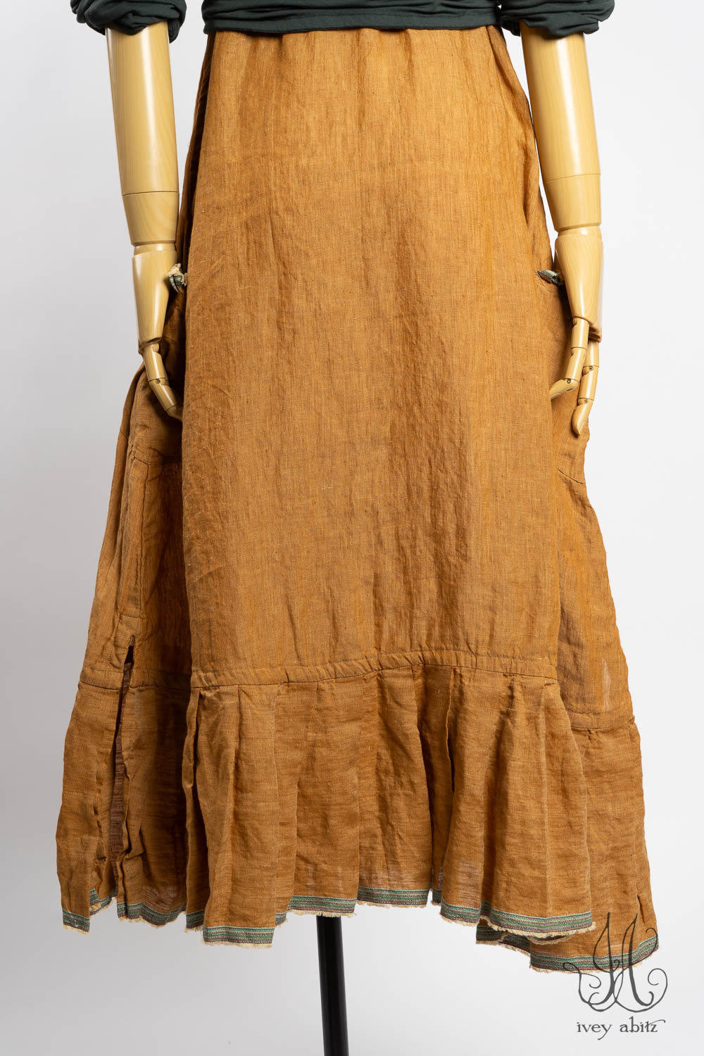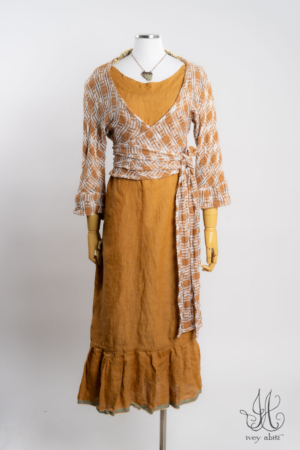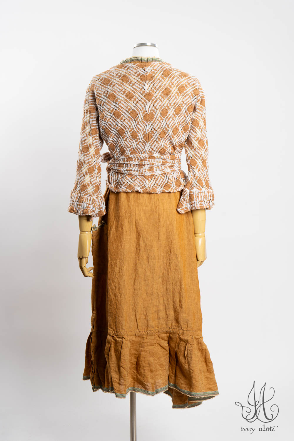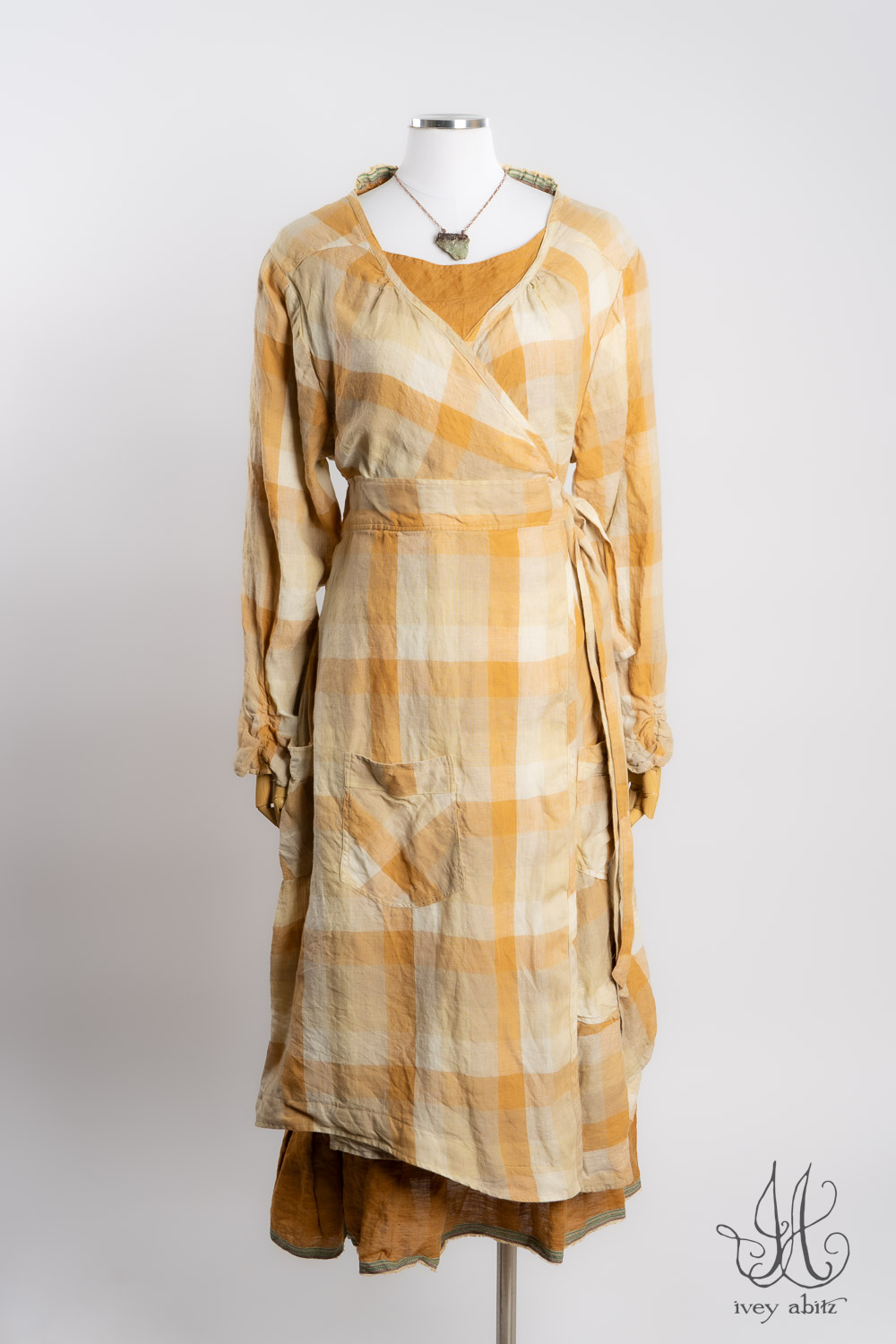 The Rennie Frock can mix and match with pretty much any Ivey Abitz design. The Rennie works especially well with shirts and duster coats that have a straight bottom hem. This echoes the straight line that is created at the top and bottom of the meticulously placed subtle pleating along the bottom hem.Â