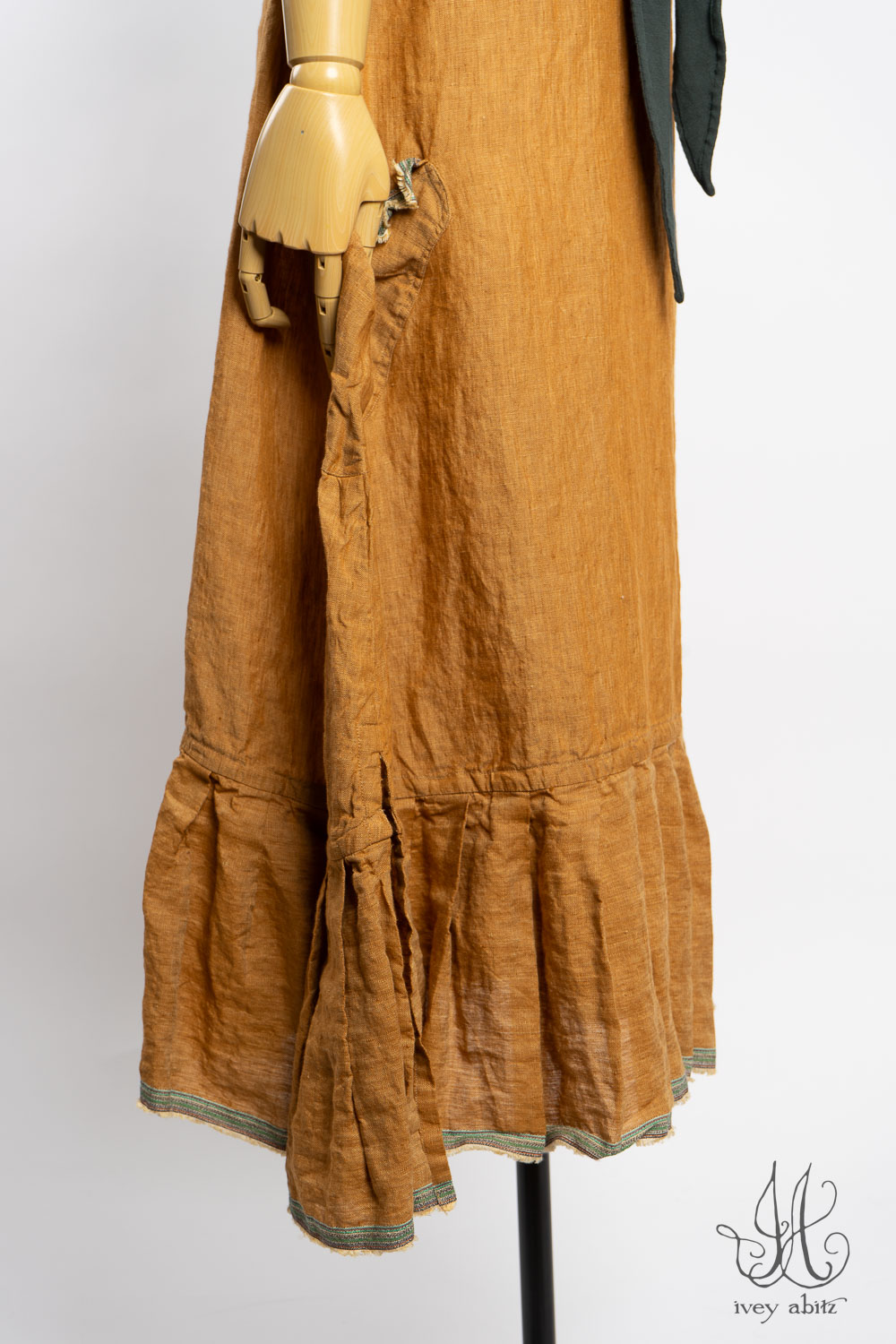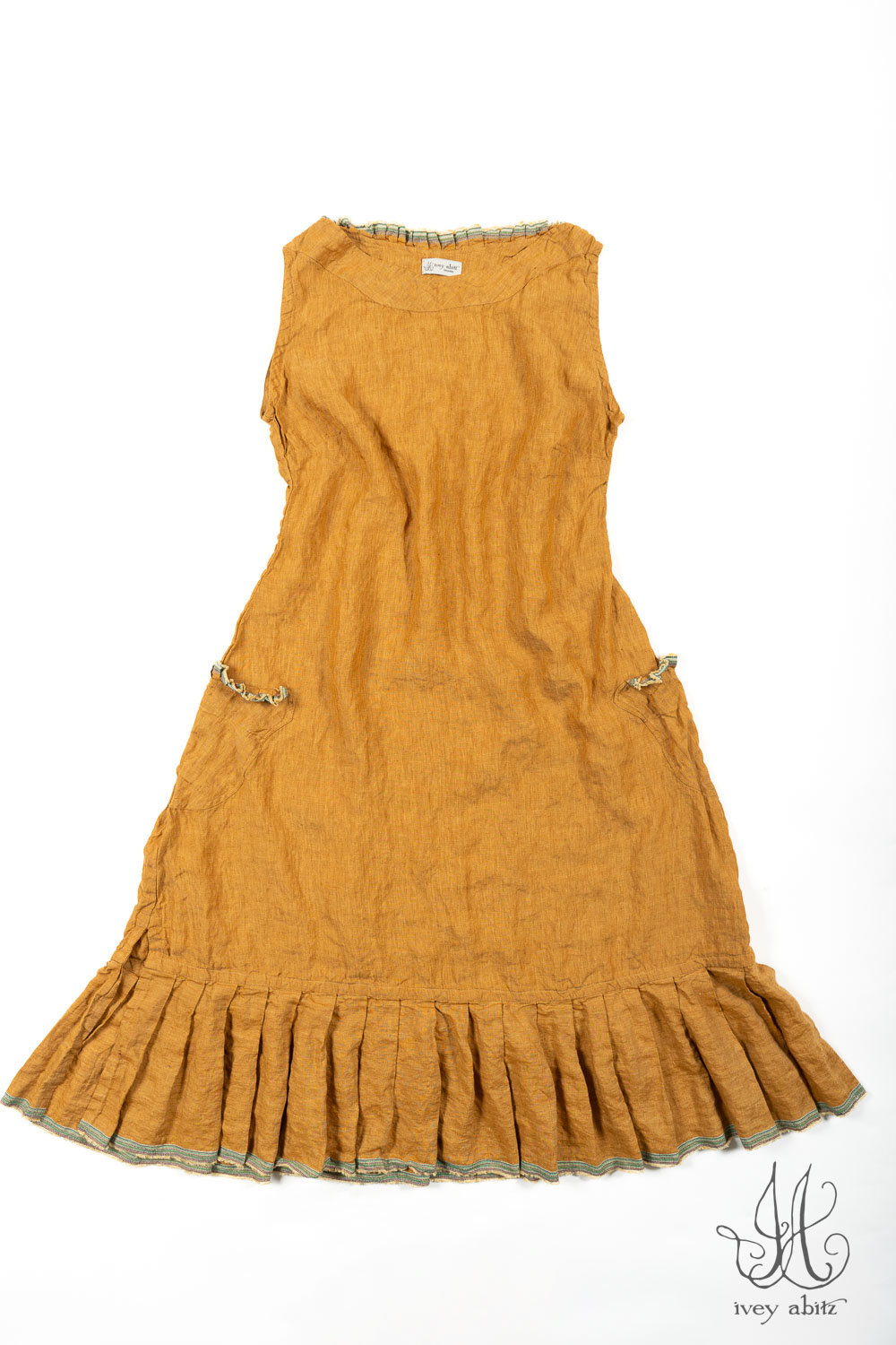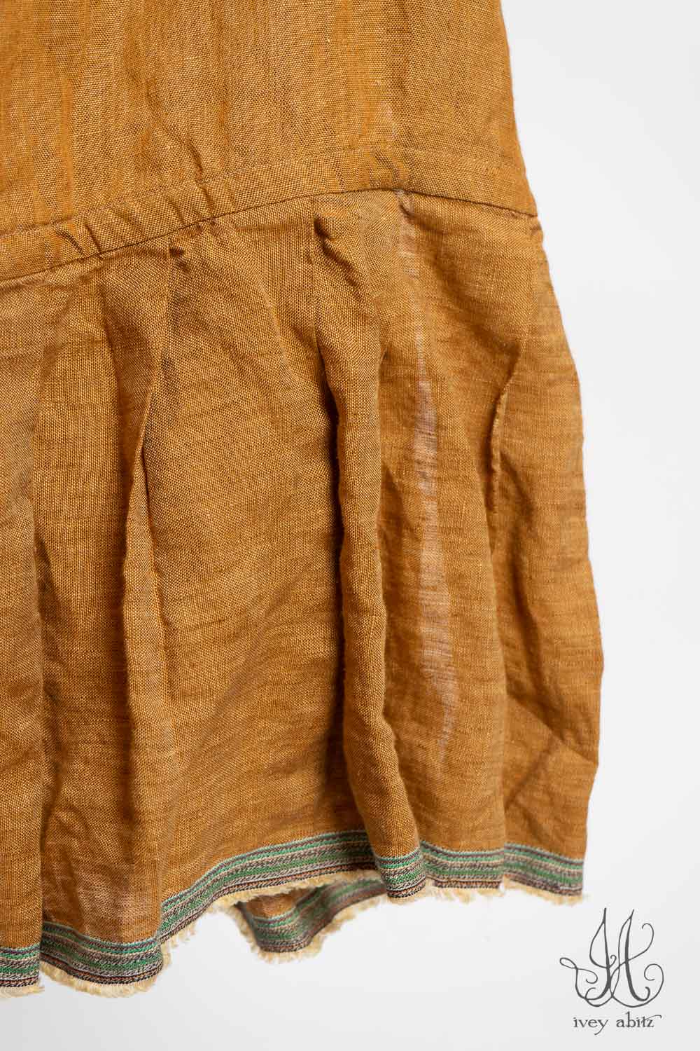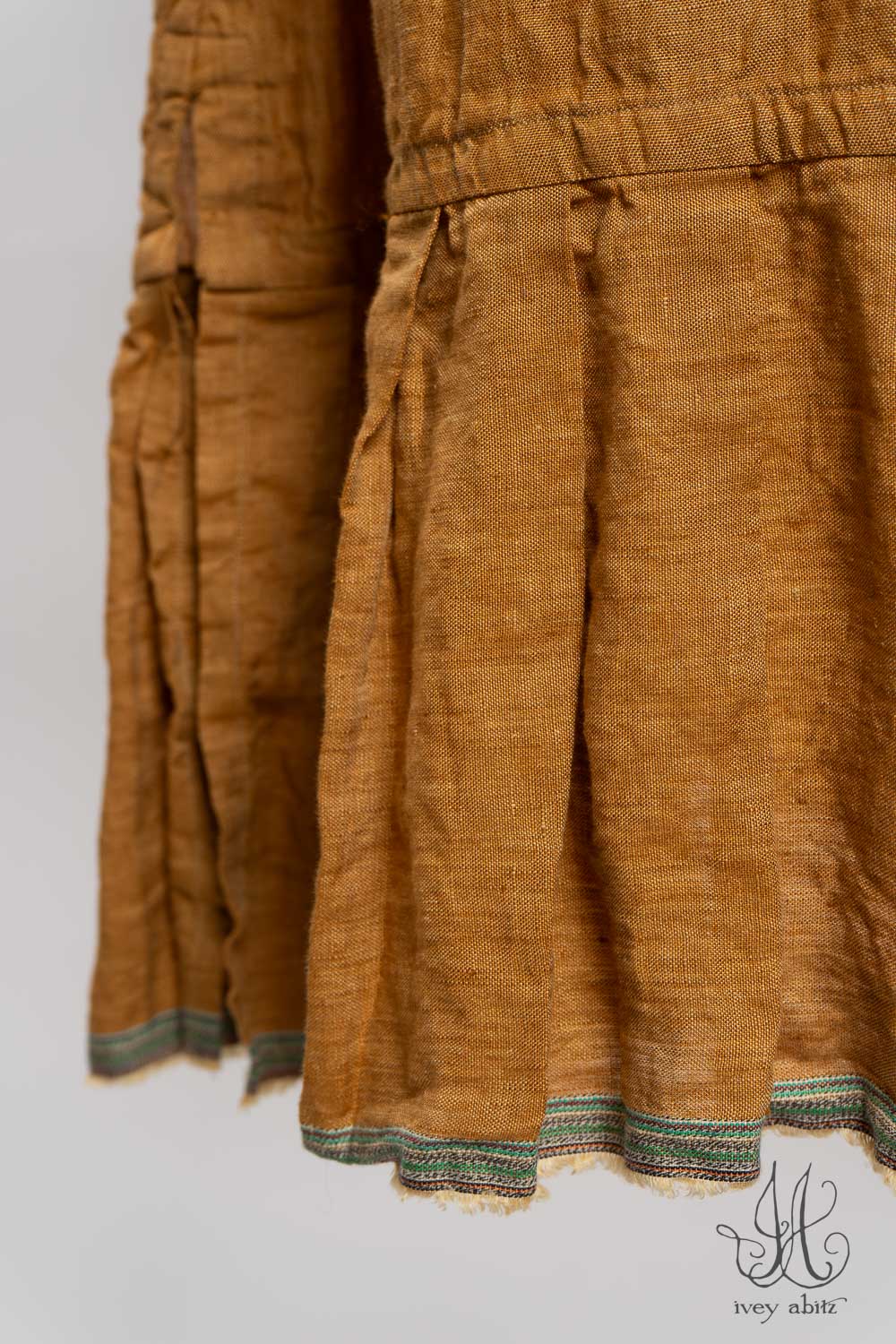 The Rennie is similar in shape and overall intent as the Wright, but the Rennie has the added detail of pleating along the back of the neck, top of the pockets, and along the bottom hem pleating. The pleating is created by the selvedge edge of the finest woven weave used in the frock itself. It visually connects with other hues in the collection.Â