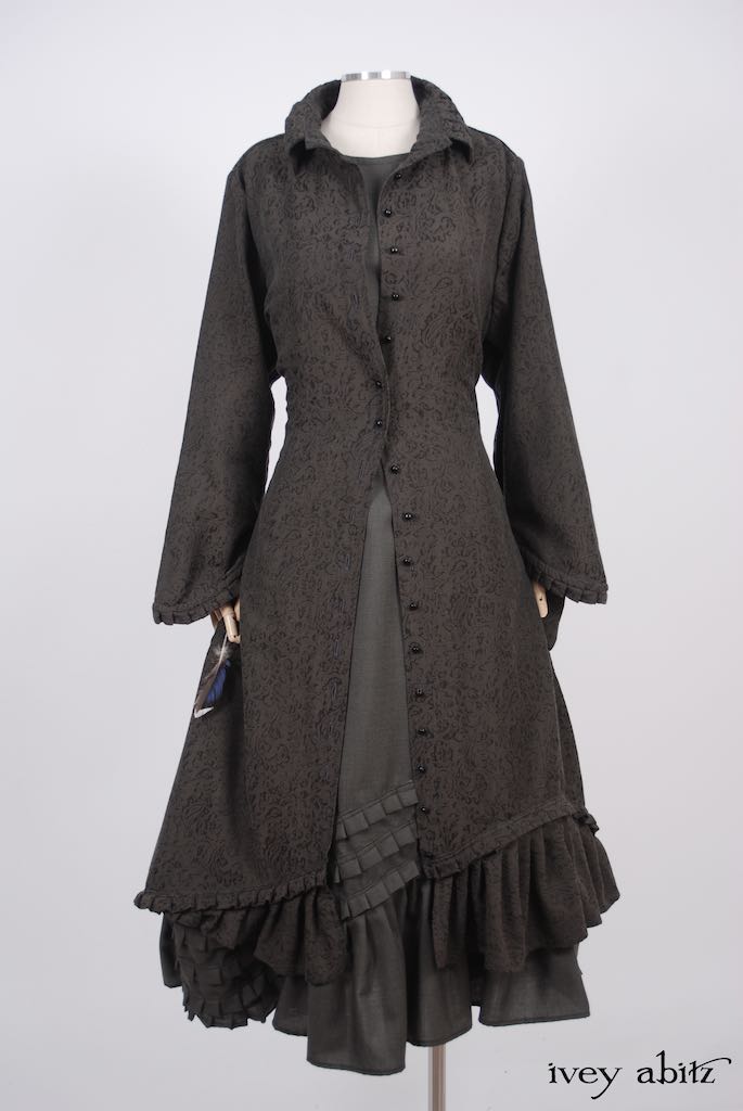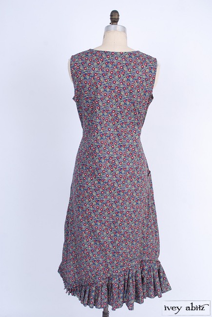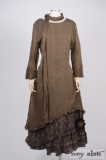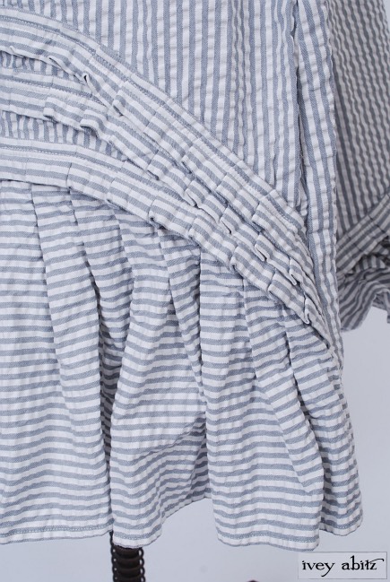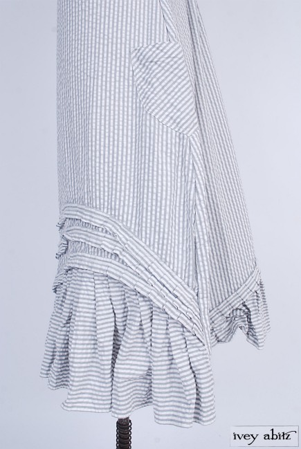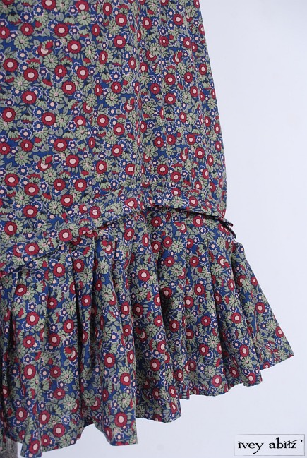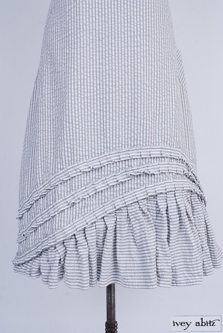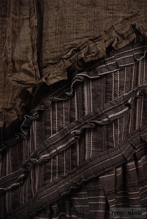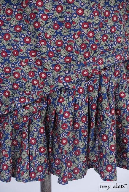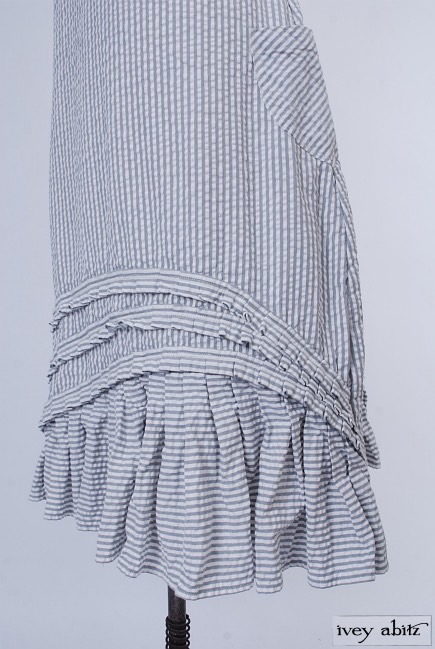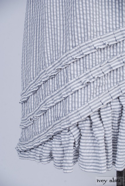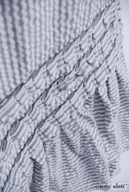 Three rows of pleating sweep across the front of the frock, curving and turning, from one side to the other. A row of longer pleats peek out from the bottom hem, anchoring the frock.