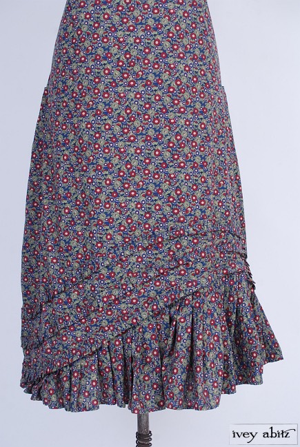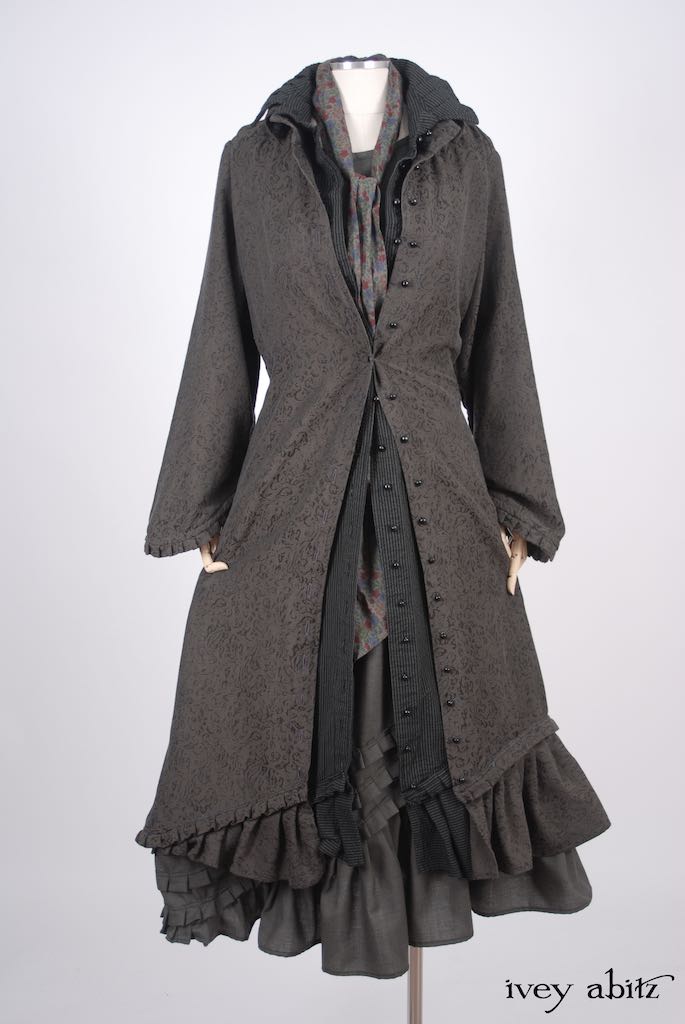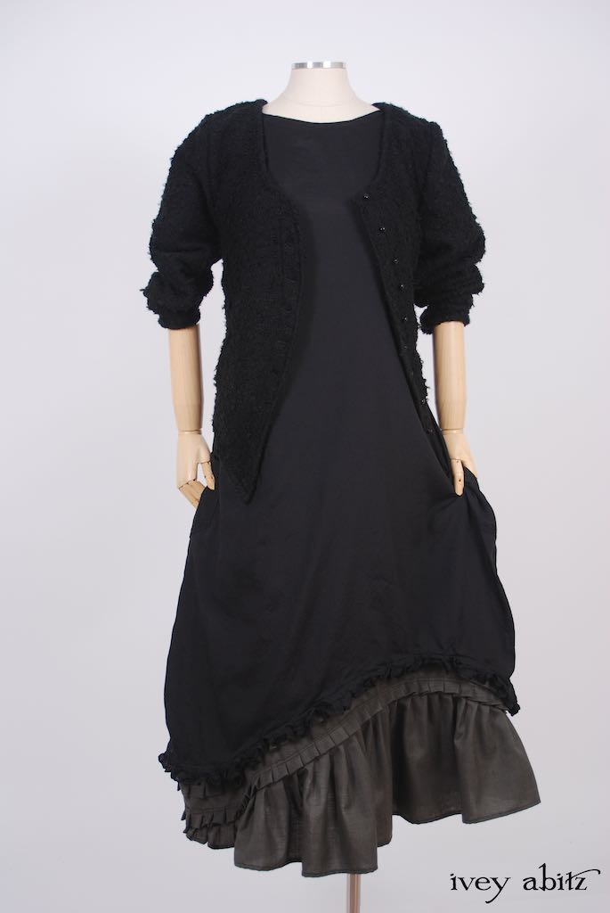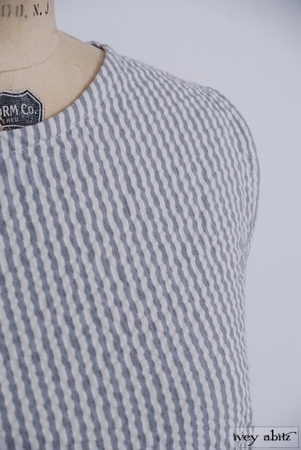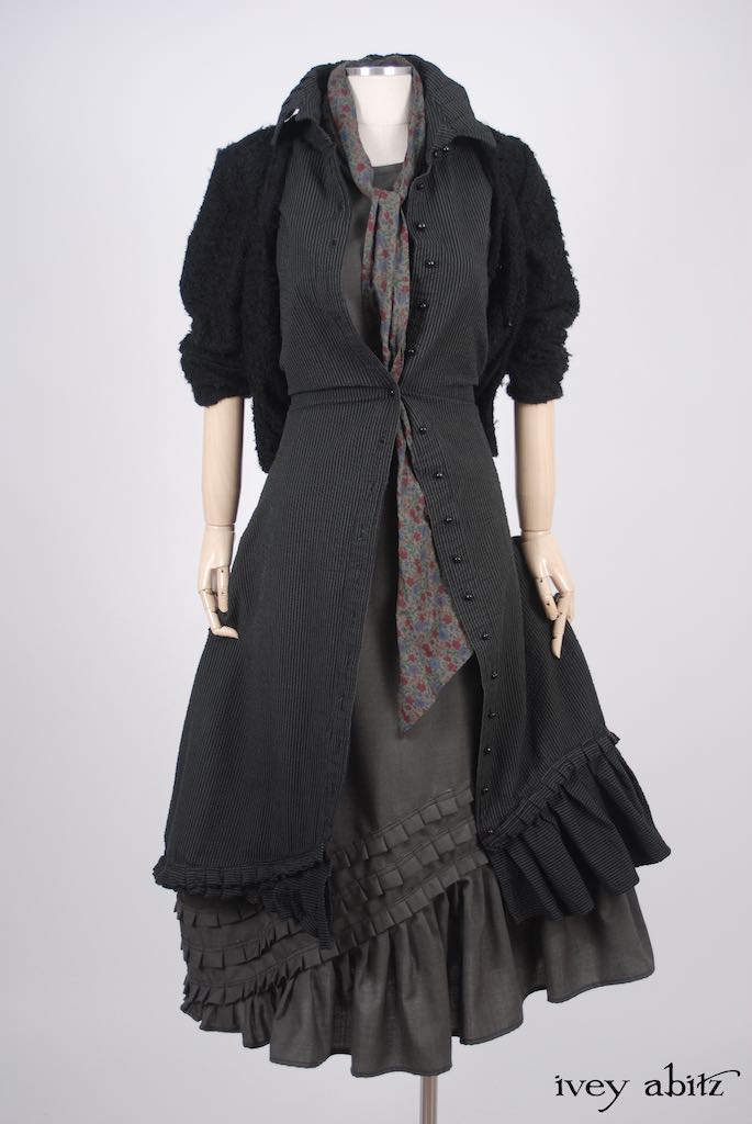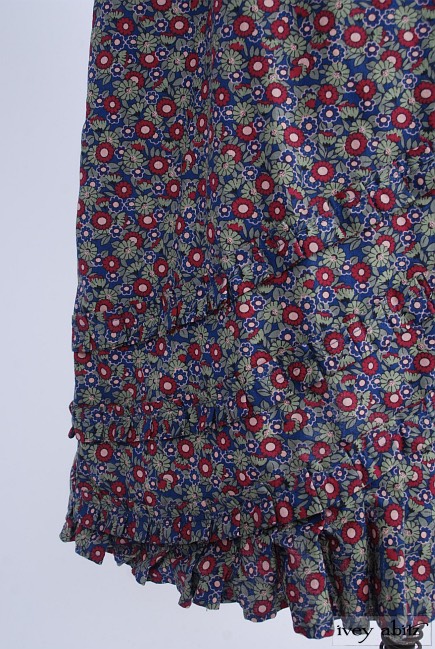 Three rows of pleating sweep across the front of the frock, curving and turning, from one side to the other. A row of longer pleats peek out from the bottom hem, anchoring the frock.