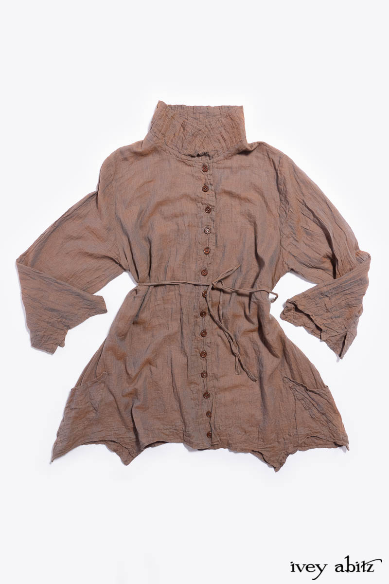 Subtle darting at the chest and a relaxed drape through the waist creates a comfortable silhouette. A wonderful a-line drape gives you ease of movement. Wraparound side ties give you the option of slightly cinching in the waist at the back of the frock or bringing the ties around to the front to create a belt-like look. If you plan to only wear the shirt with a straighter and looser silhouette, you may order it without side ties.