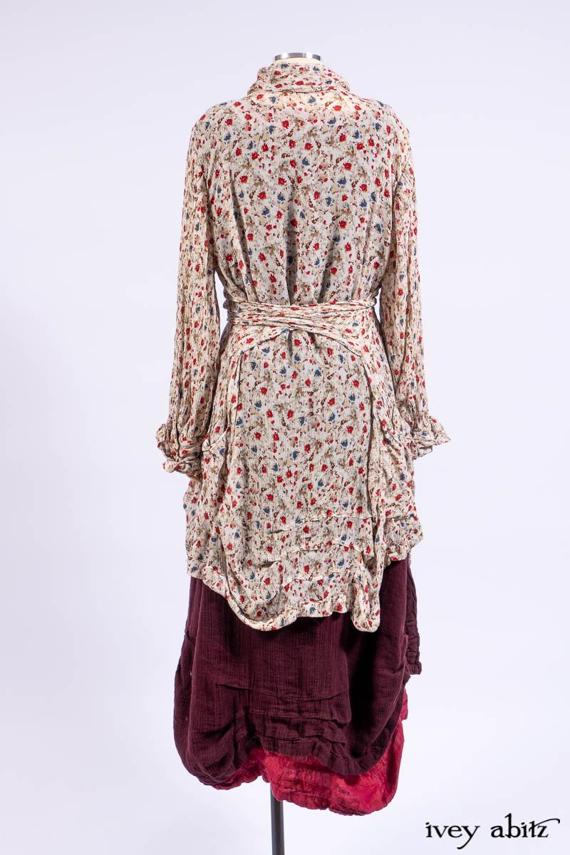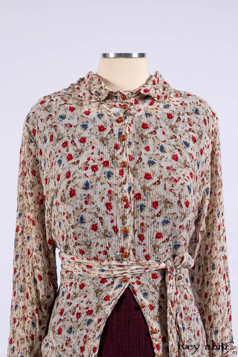 - Purposeful folds and gathers are scattered across the front and back of the shirt jacket. Tucked here, tucked there, and it’s all good.