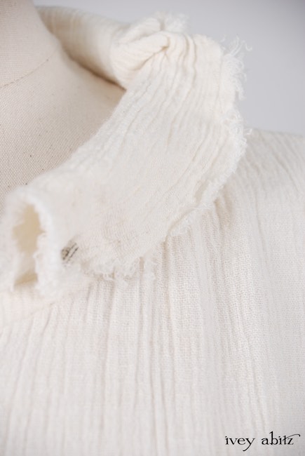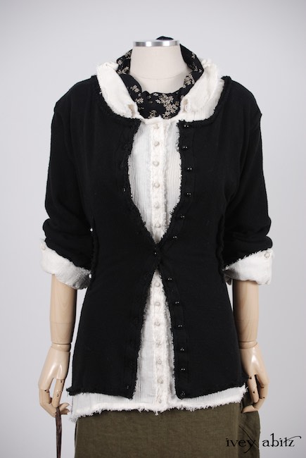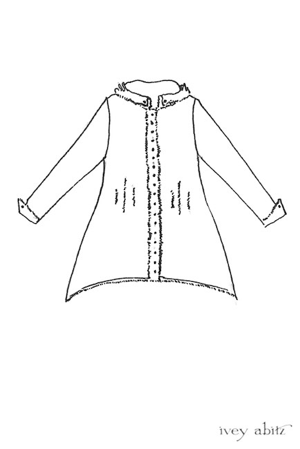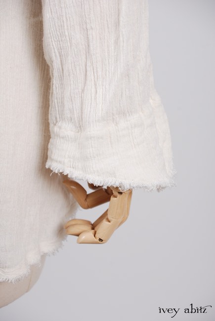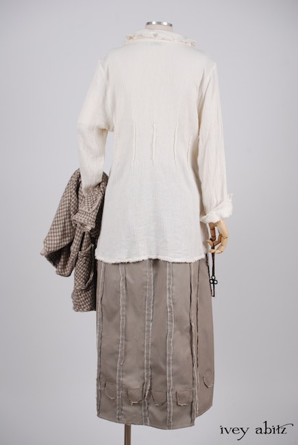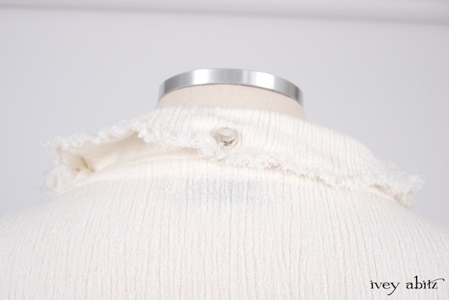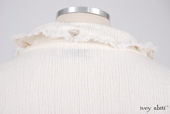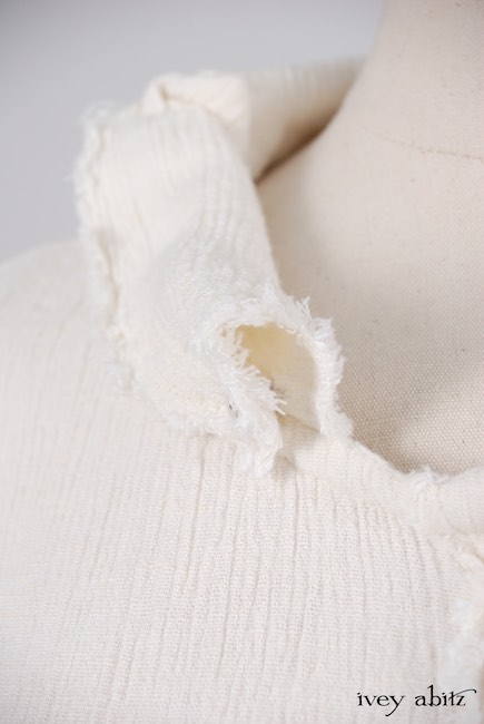 - A series of vertical raw edged darts create a lovely tapering in at the waist and add texture to the design.