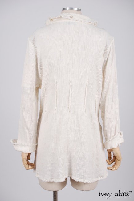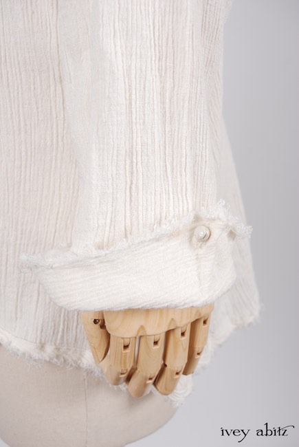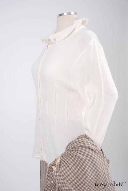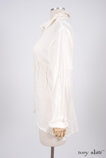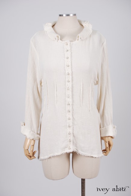 - Raw edging adorns the collar, cuffs, button placket, and bottom hem of the shirt.