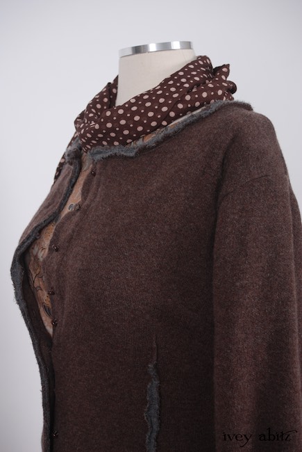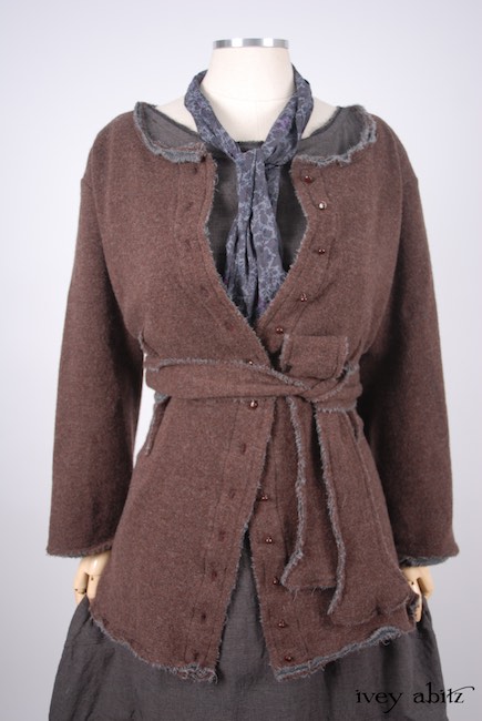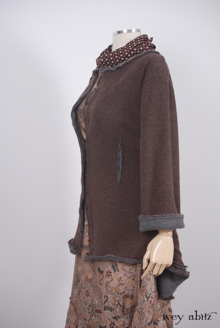 - Raw edged bias cut binding adorns the neckline, sleeve edges, and bottom hem of the jacket.