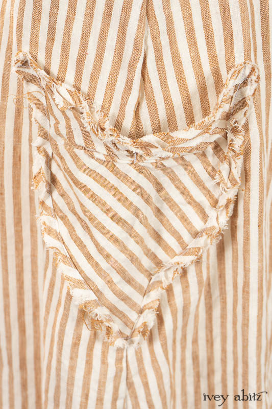 - Side seam pockets are adorned with raw edging, emulating the detail along the neckline and bottom hem.