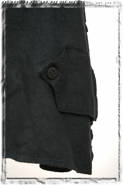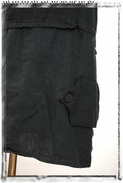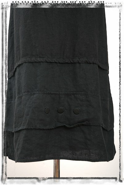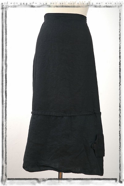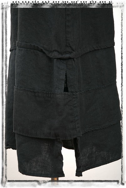 - Pointed tab closure on left of skirt wraps over outer side slit on hem.