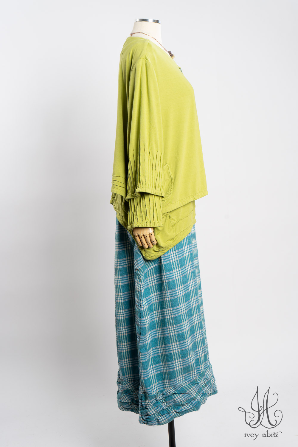 The Fitzgerald can be created for you in one of our premium solid weaves for more subtle everyday layering. Want to make a statement and wear it more as a featured piece? We love this idea! Go with a stripe or plaid. The textured band along the bottom hem will be bias cut, adding additional visual interest to an already stunningly sculptural piece.