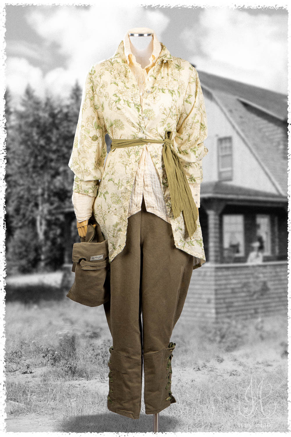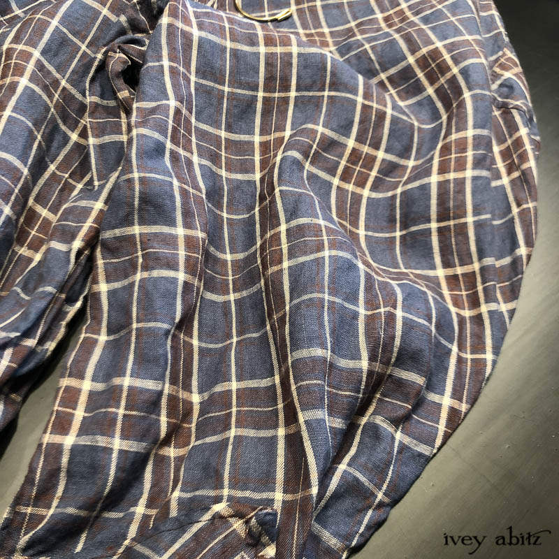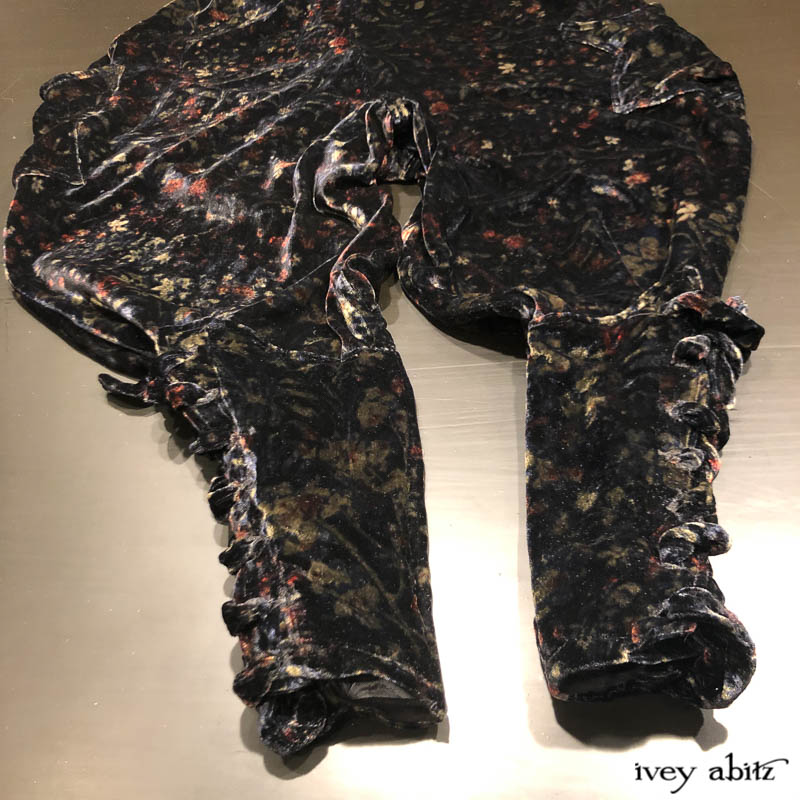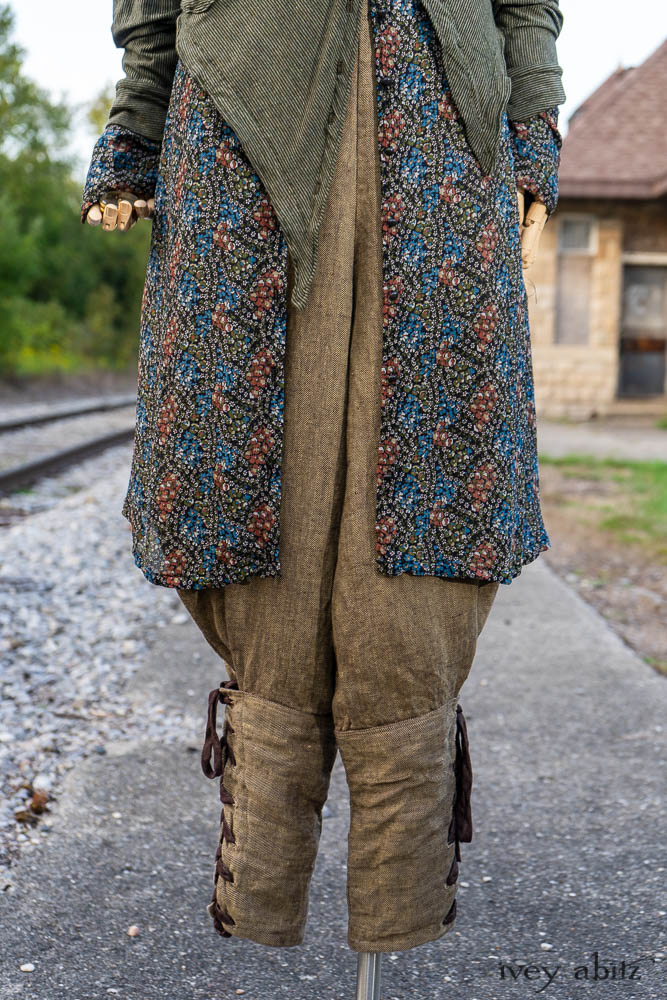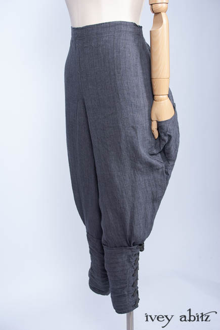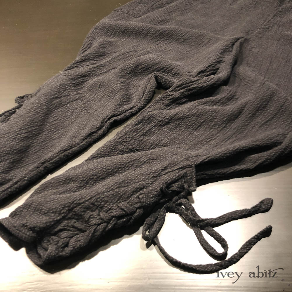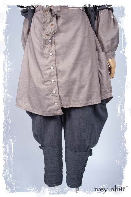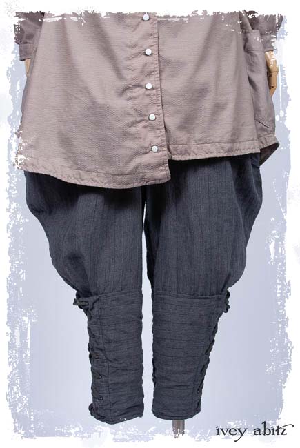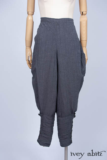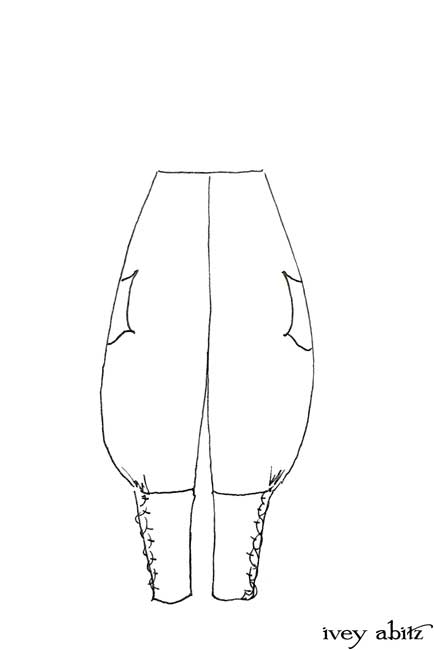 • Long front and back rise creates a flattering drape and makes for an easy fit. Slight a-line drape in the trouser leg so there is easy movement through the hip area. Then, they taper in below the knee and get cinched in at the calfs.
