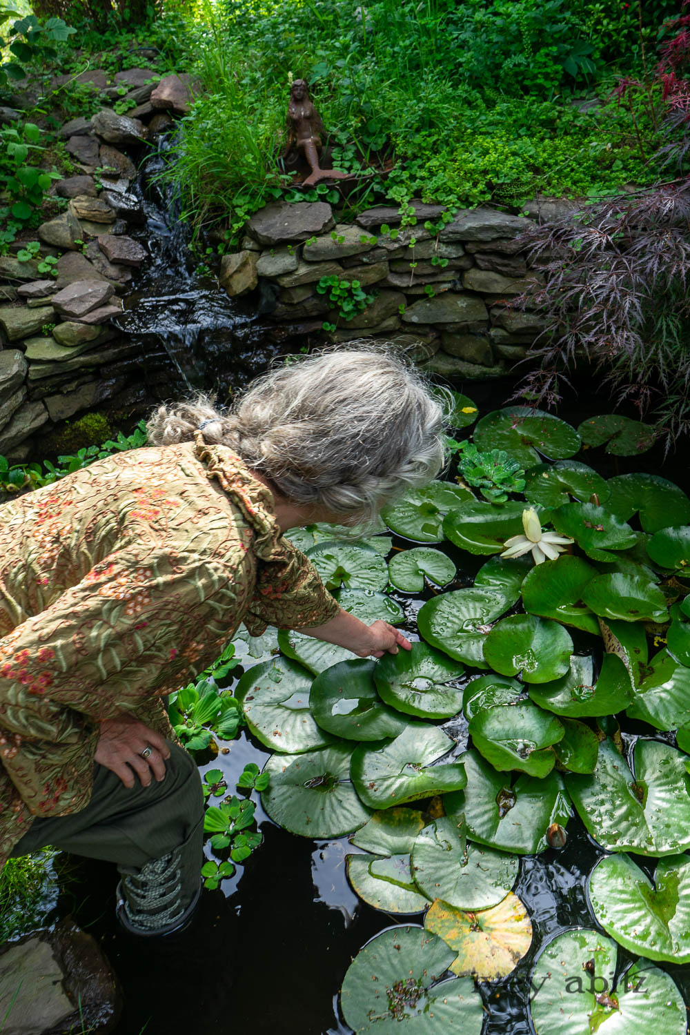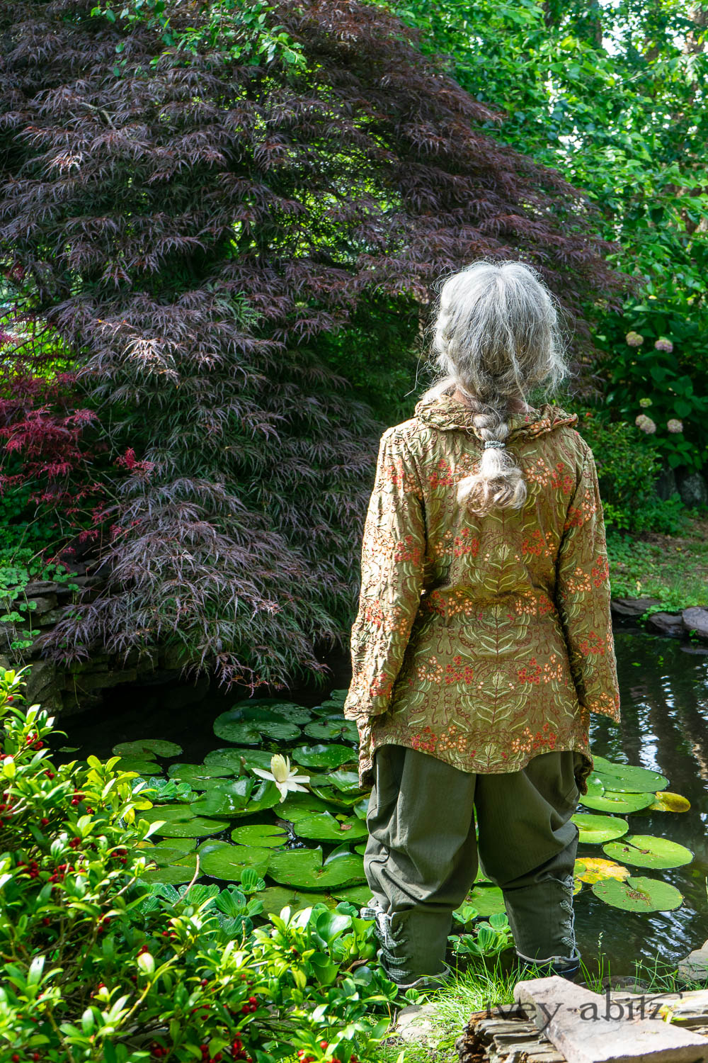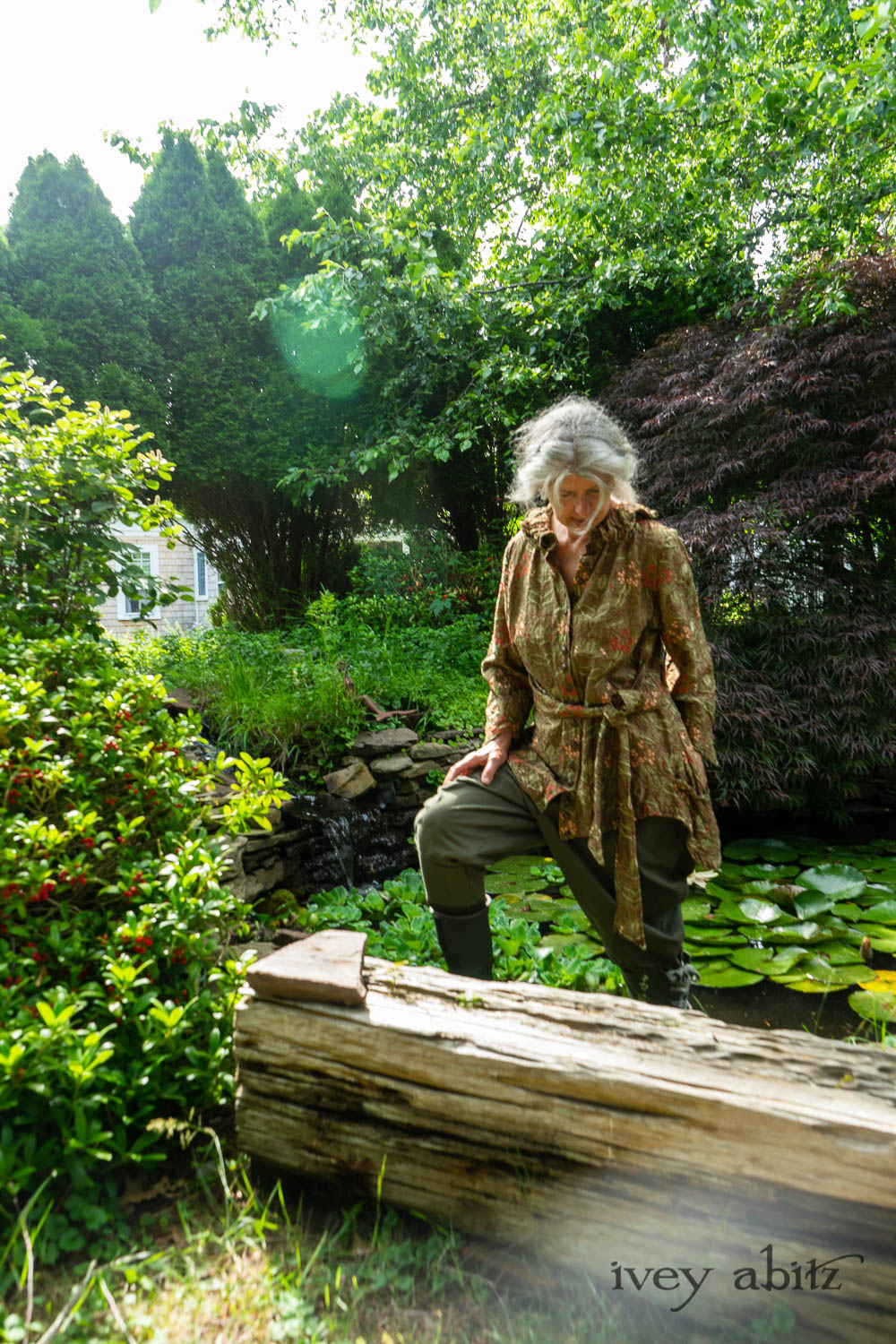 Cynthia Ivey Abitz, clothing designer, walks the beach with part of her shih tzu pack.