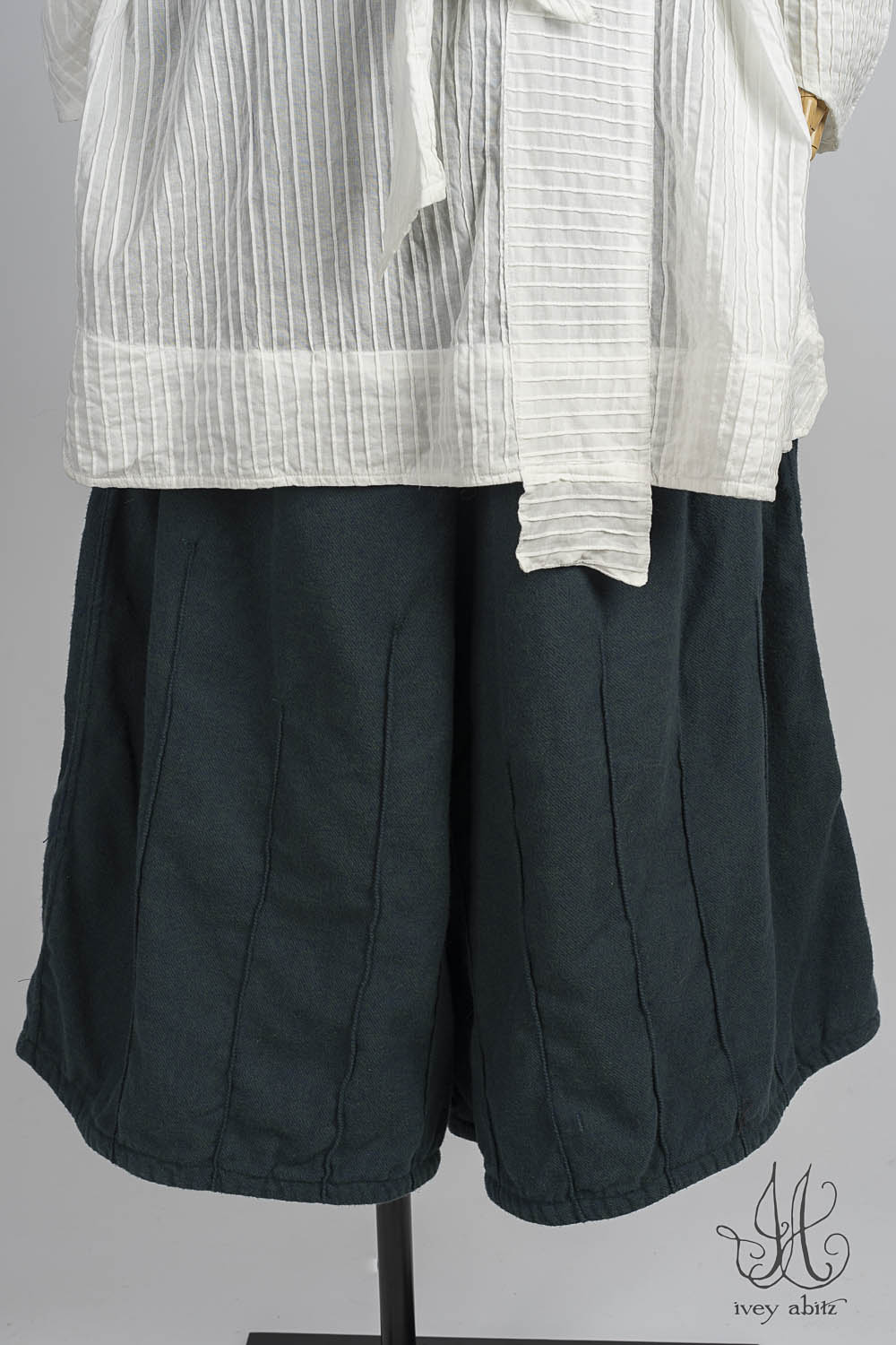There is something special about Mercer’s work. It has a combination of freedom and repetition that is quite something. It speaks to the authentic heart. The Mercer designs are in honor of such vision and willingness to realize a dream. Playful yet purposeful handmade pin tucks are at the heart of the Mercer Trousers. They adorn the front and back of the frock, its side seam pockets, and the clever straps on the shoulders.