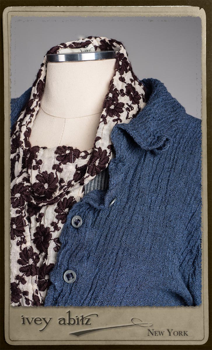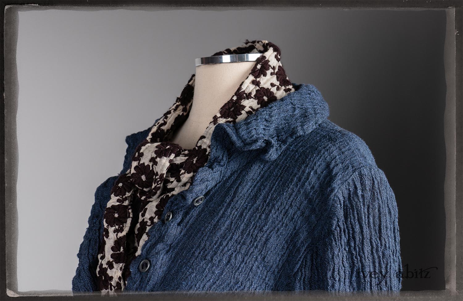 • An usual collar with unexpected points and curves catches the eye. Similar points and curves are echoed in the detail at the sleeve edge. The button placket echoes a similar curve motif.