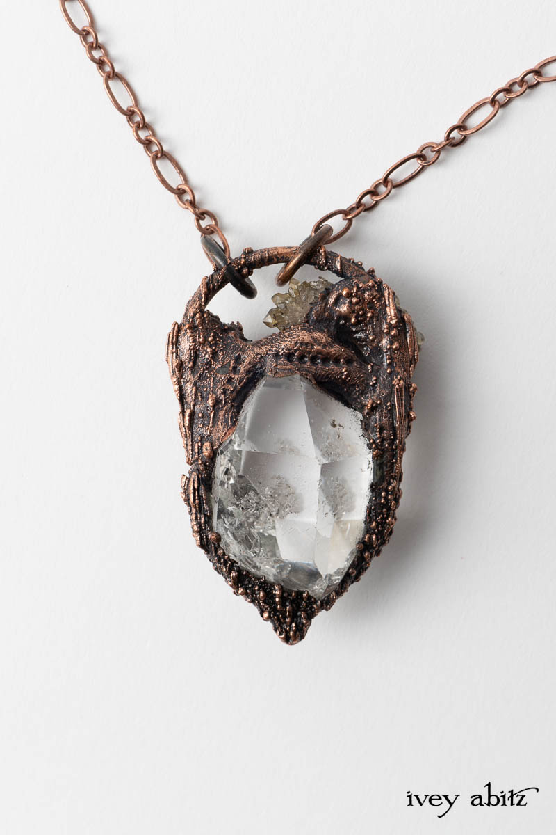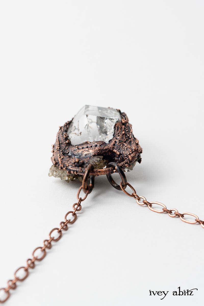 We are collaborating with a wonderfully kind and talented jewelry artist named Dori who mines for the Herkimer Diamonds herself with a sledge hammer and chisel. Then, she makes them into necklaces using a rustic copper setting and chain.