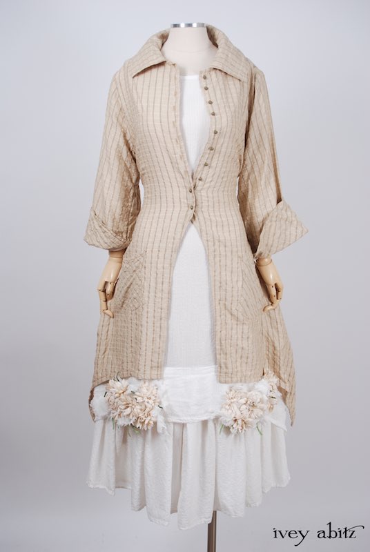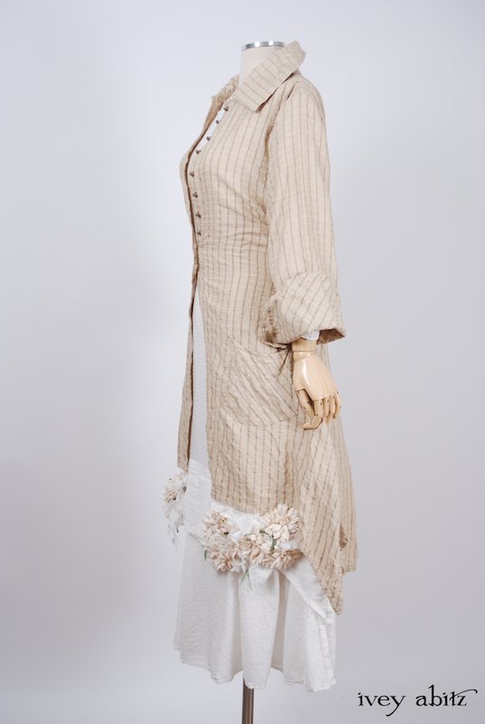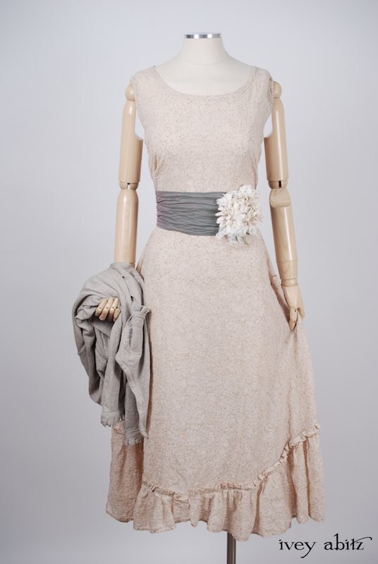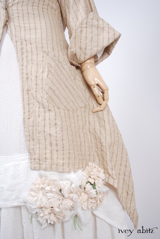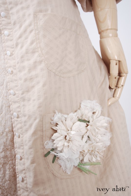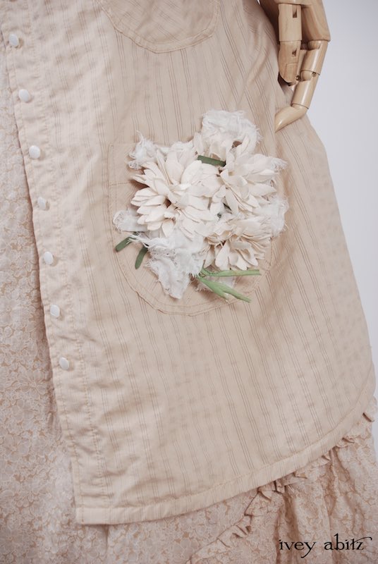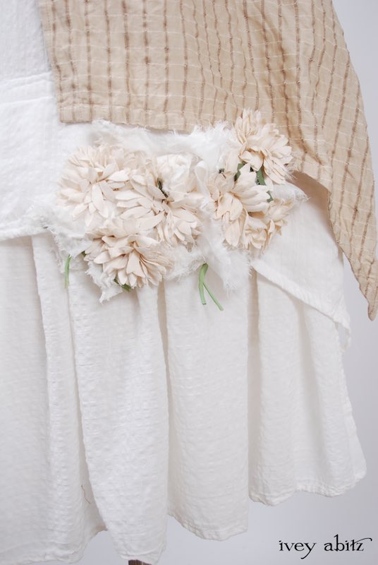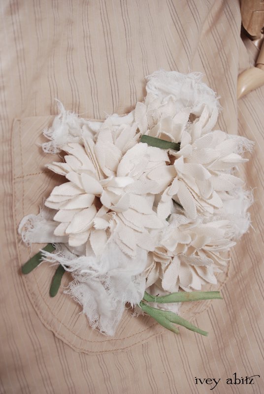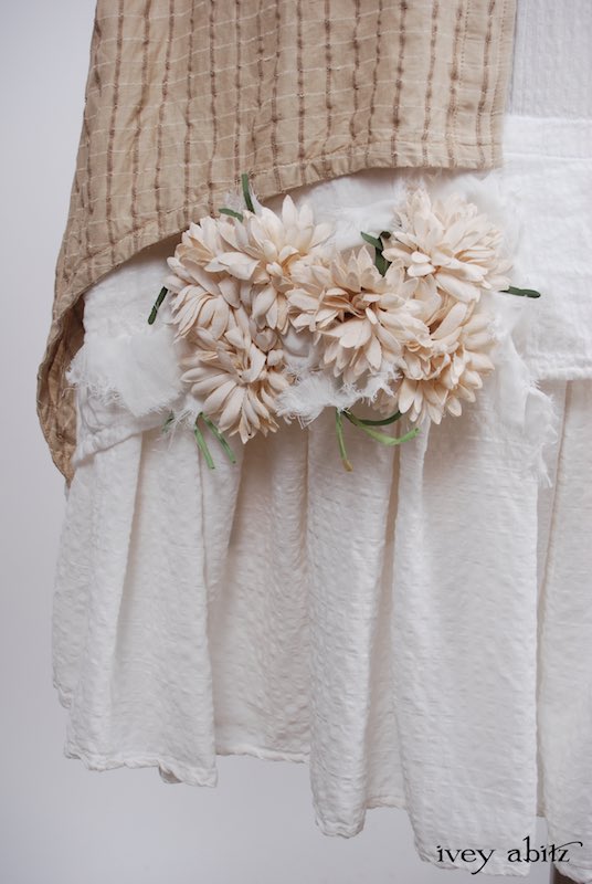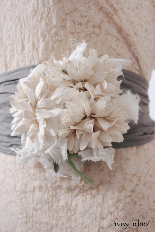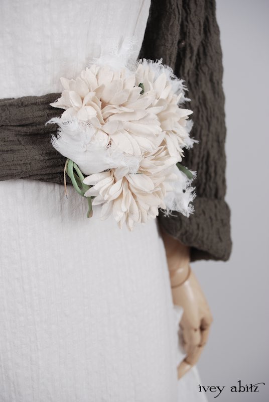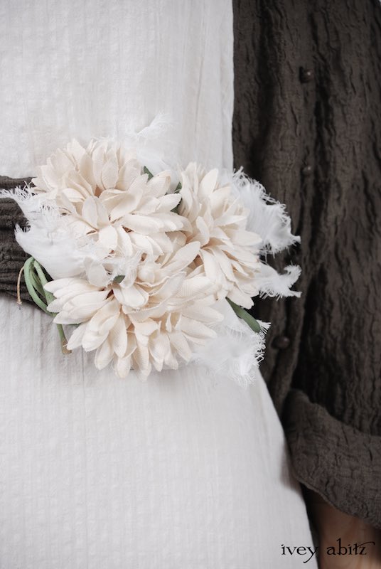 We have combined a vintage European floral embellishment, circa 1930’s, with our rare new weaves from Summer 2017. A metal clasp is sewn onto the back of the brooch so it can be pinned on the collar, waistband, or bottom hem of your skirting. Slip a ribbon through the clasp, and you can wrap it around your wrist as a corsage.