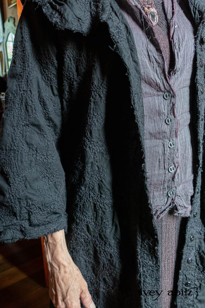 - Celia Duster Coat in Black Diamond Embroidered Leaf Weave