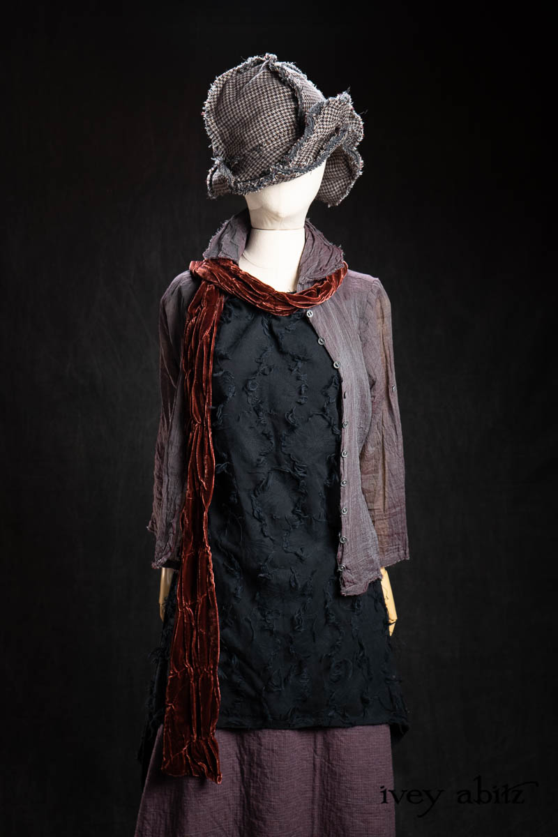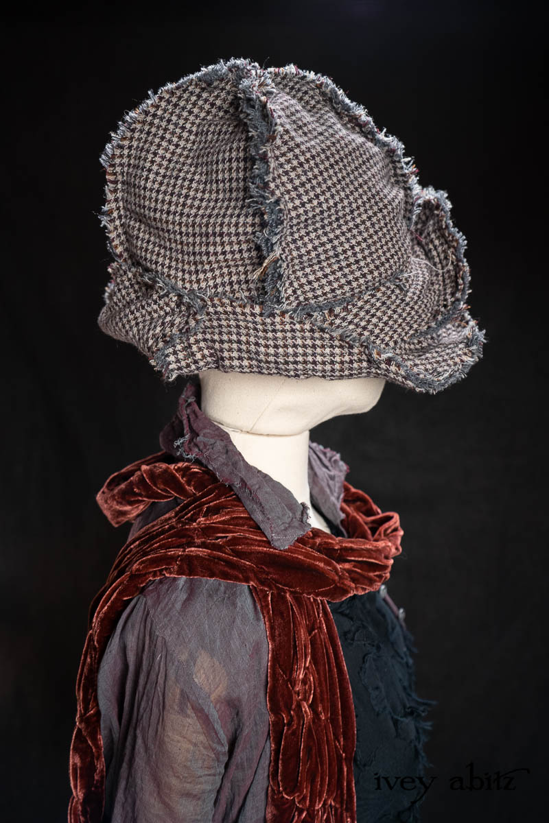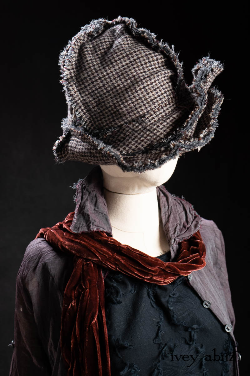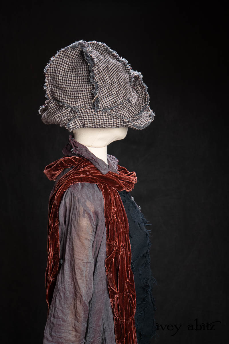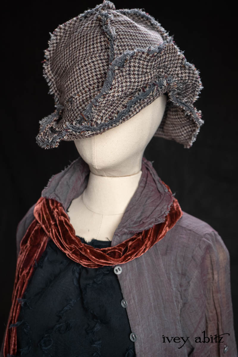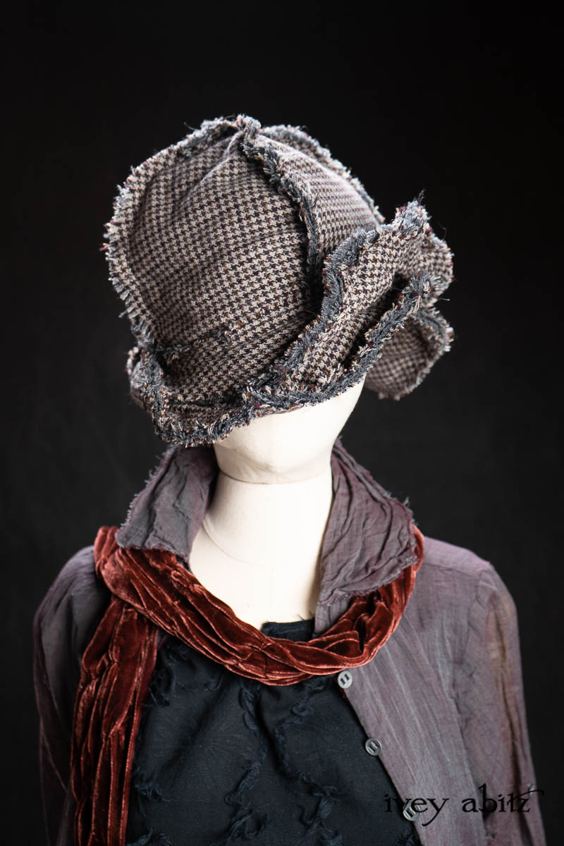 Bonheur Hat in Pewter and Amethyst Houndstooth Wool; Sollie Shirt in Amethyst and Pewter Washed Voile; Tollie Sash in Amethyst Silk Velvet; Ardsley Frock in Black Diamond Rustic Embroidered Floral Weave; Limited Edition Gilbert Cardigan in Earth and Iron Petite Stripe Knit; Celia Skirt in Amethyst Flannel Backed Plaid; Bonheur Brooch in Black Sculpted Felt. – Bespoke clothing by Ivey Abitz.
