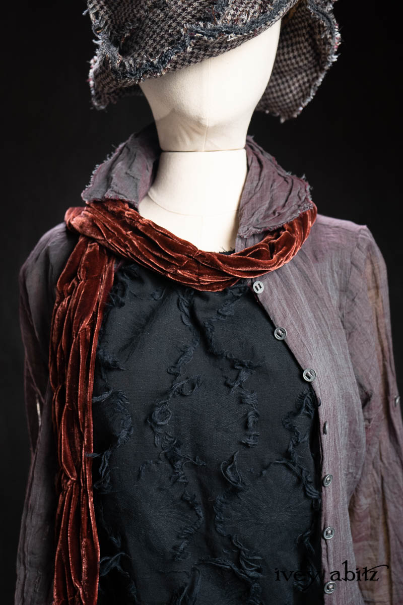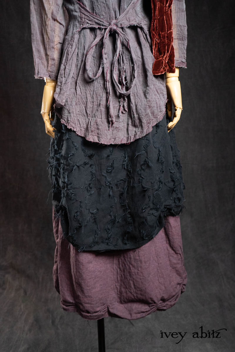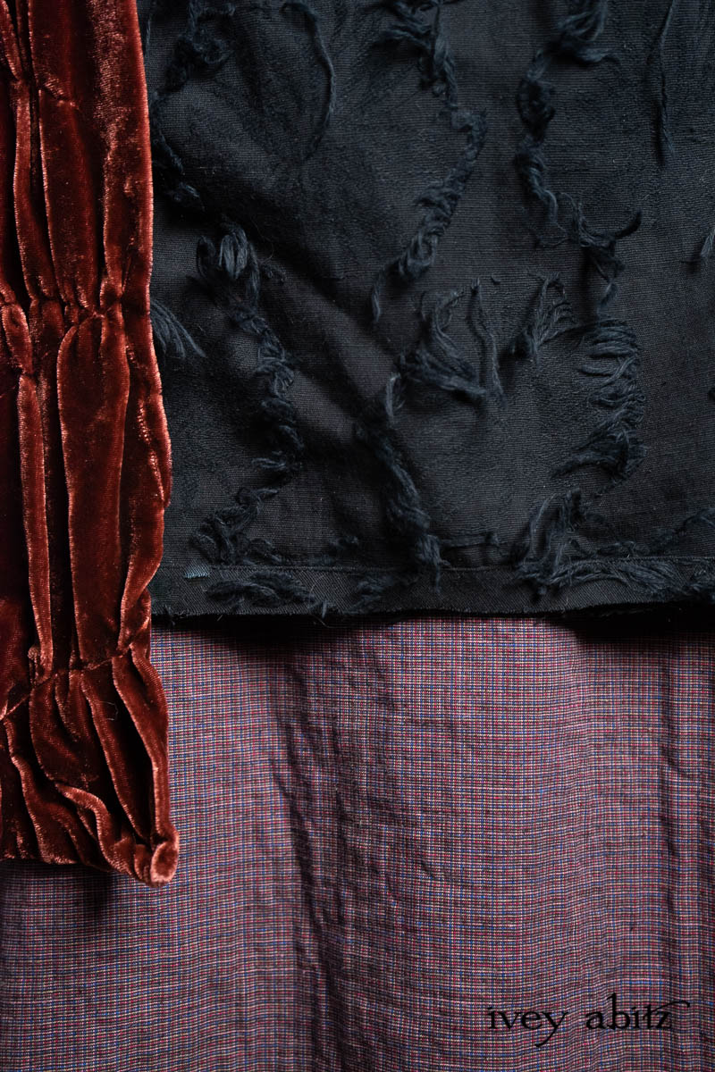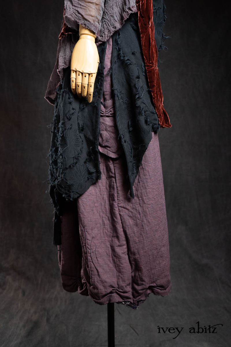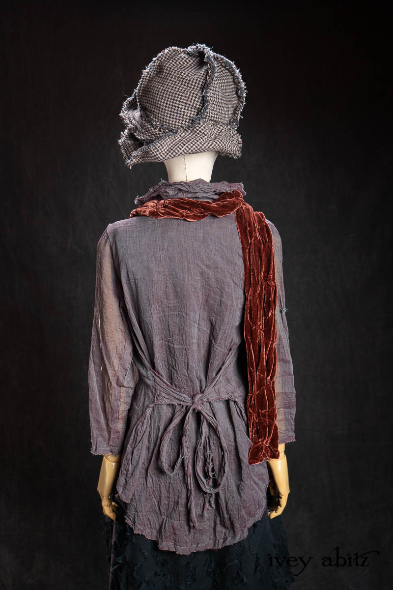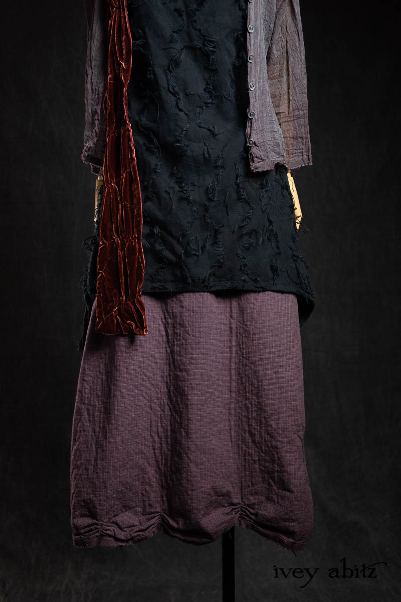 Bonheur Hat in Pewter and Amethyst Houndstooth Wool; Sollie Shirt in Amethyst and Pewter Washed Voile; Tollie Sash in Amethyst Silk Velvet; Ardsley Frock in Black Diamond Rustic Embroidered Floral Weave; Limited Edition Gilbert Cardigan in Earth and Iron Petite Stripe Knit; Celia Skirt in Amethyst Flannel Backed Plaid; Bonheur Brooch in Black Sculpted Felt. – Bespoke clothing by Ivey Abitz.