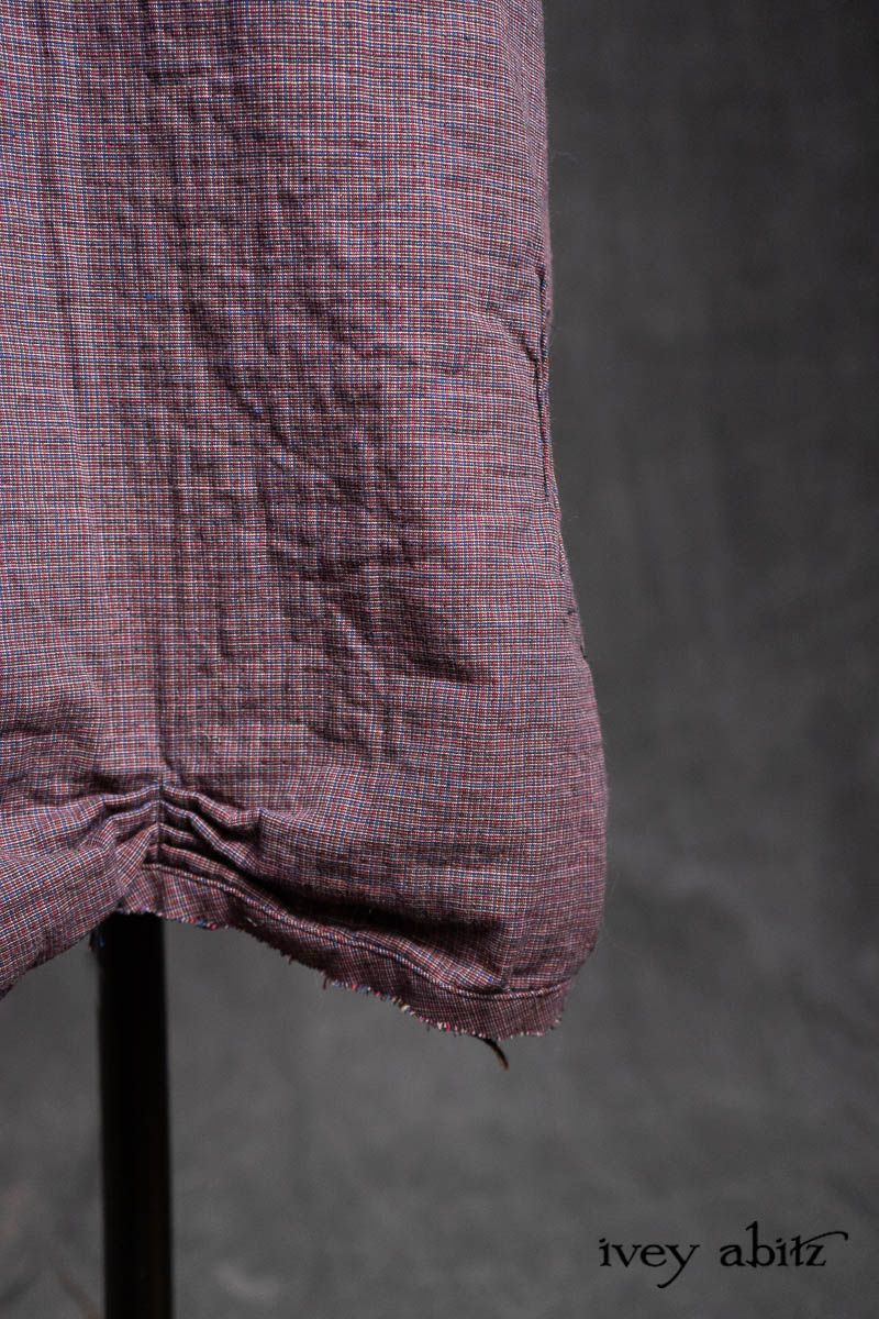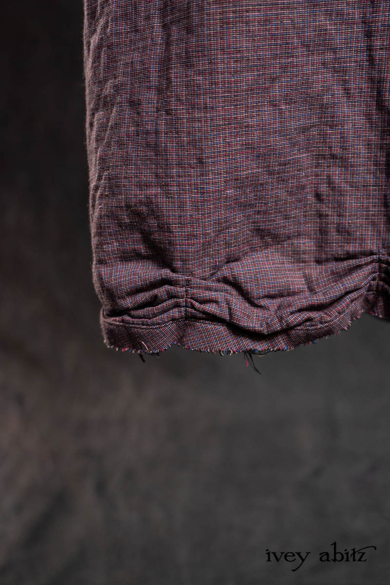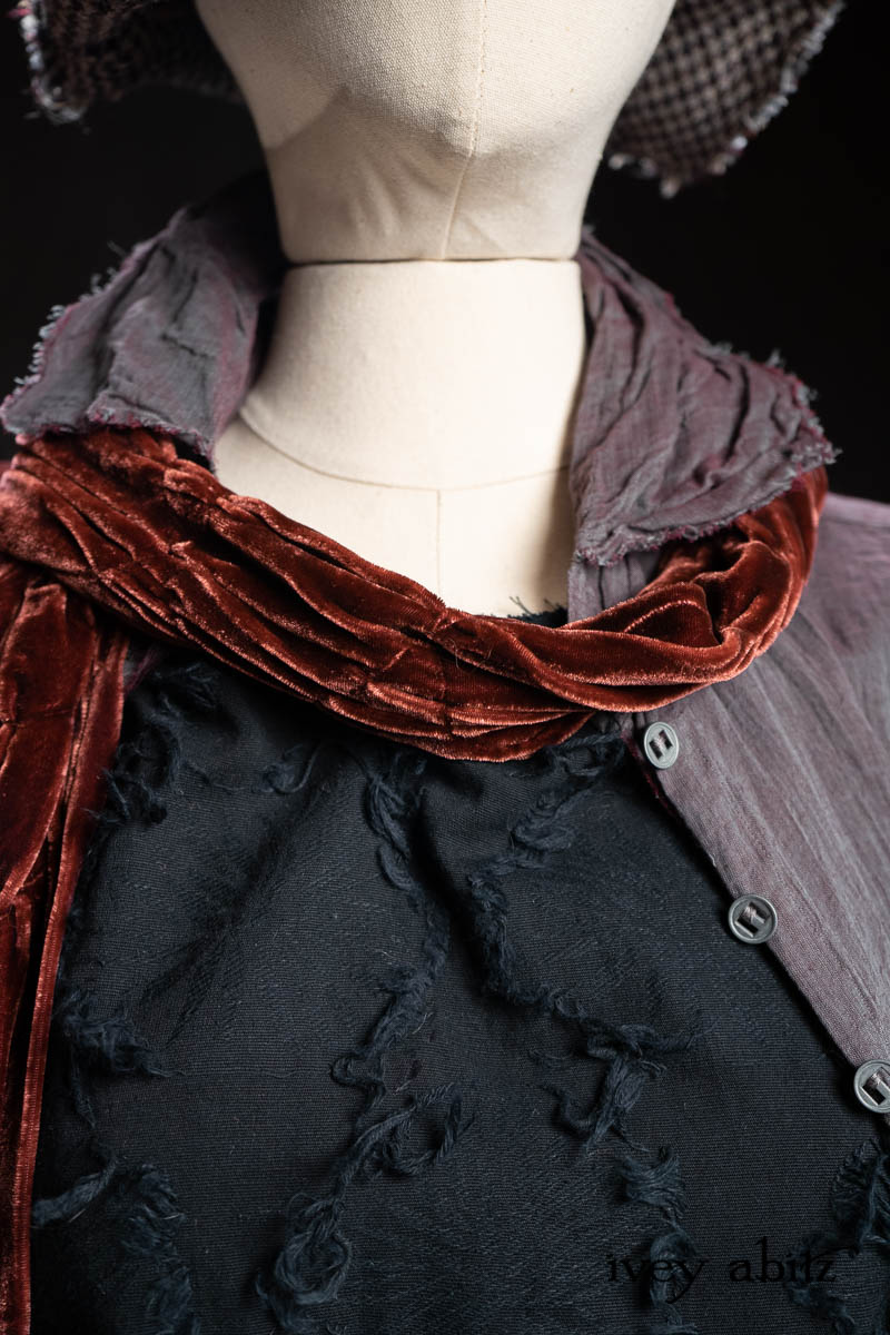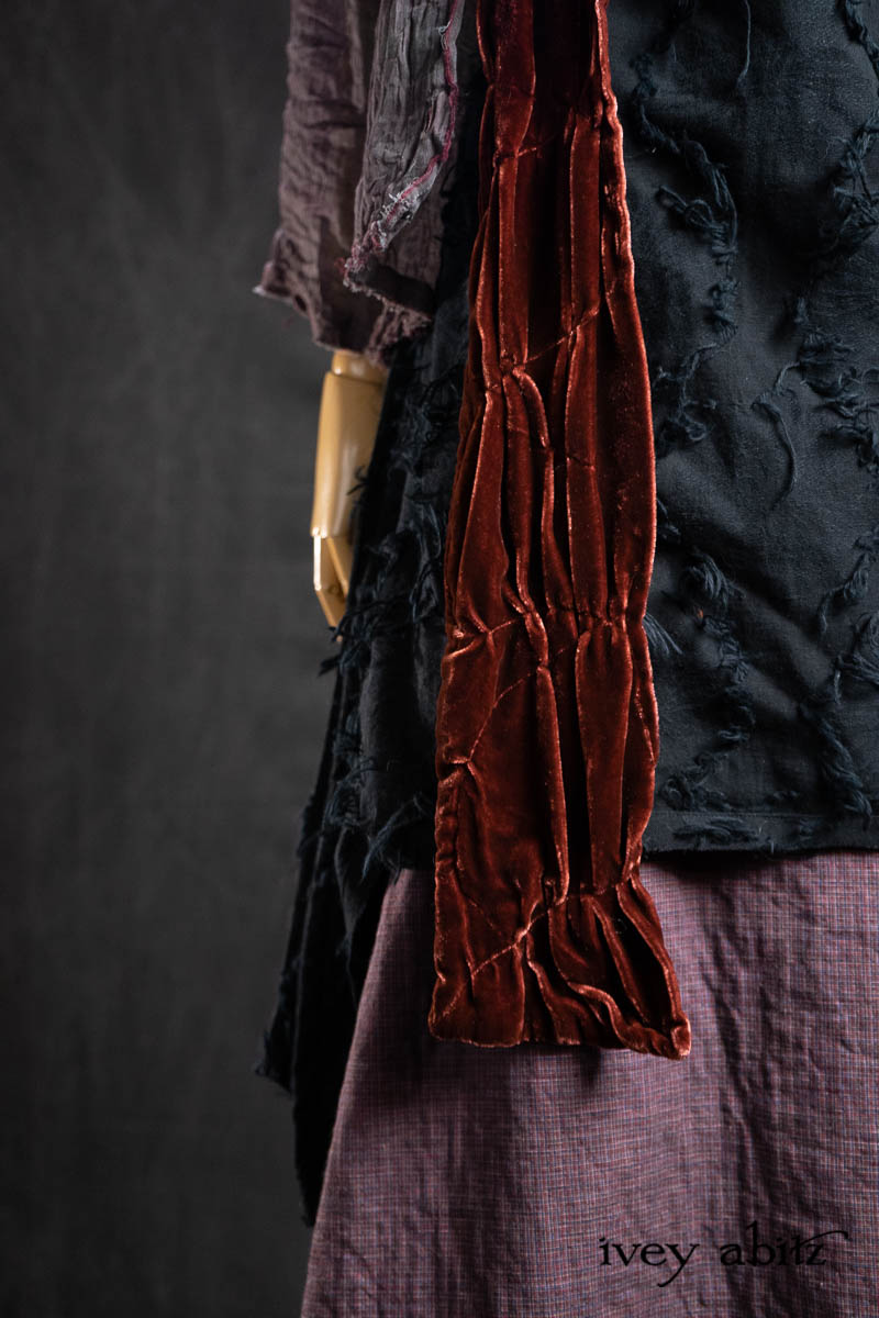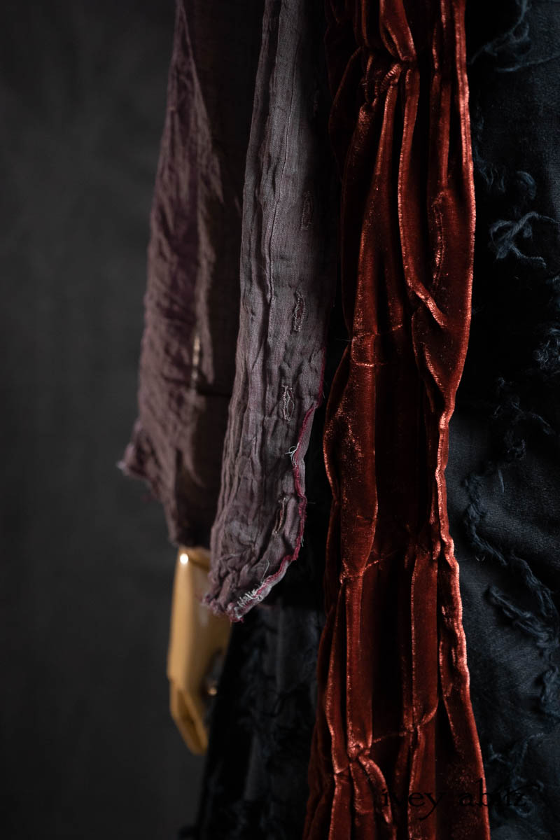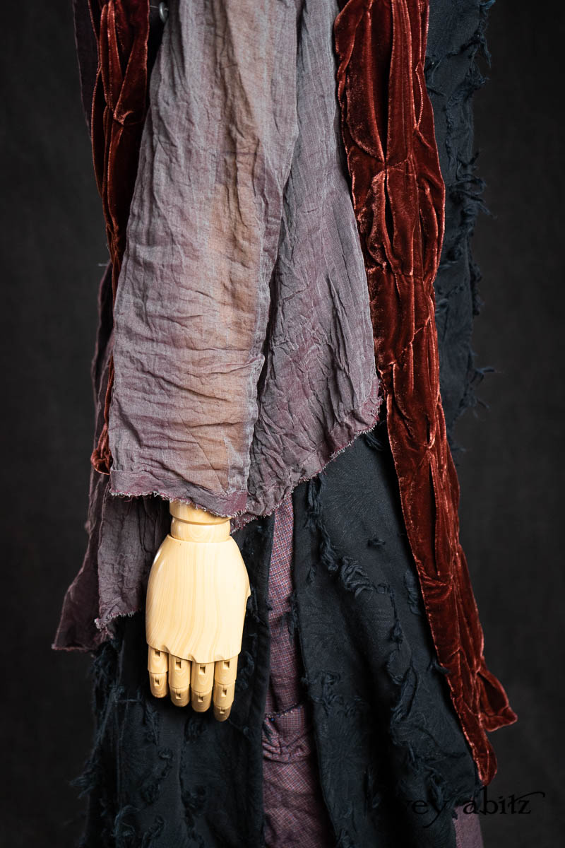 Bonheur Hat in Pewter and Amethyst Houndstooth Wool; Sollie Shirt in Amethyst and Pewter Washed Voile; Tollie Sash in Amethyst Silk Velvet; Ardsley Frock in Black Diamond Rustic Embroidered Floral Weave; Limited Edition Gilbert Cardigan in Earth and Iron Petite Stripe Knit; Celia Skirt in Amethyst Flannel Backed Plaid; Bonheur Brooch in Black Sculpted Felt. – Bespoke clothing by Ivey Abitz.
