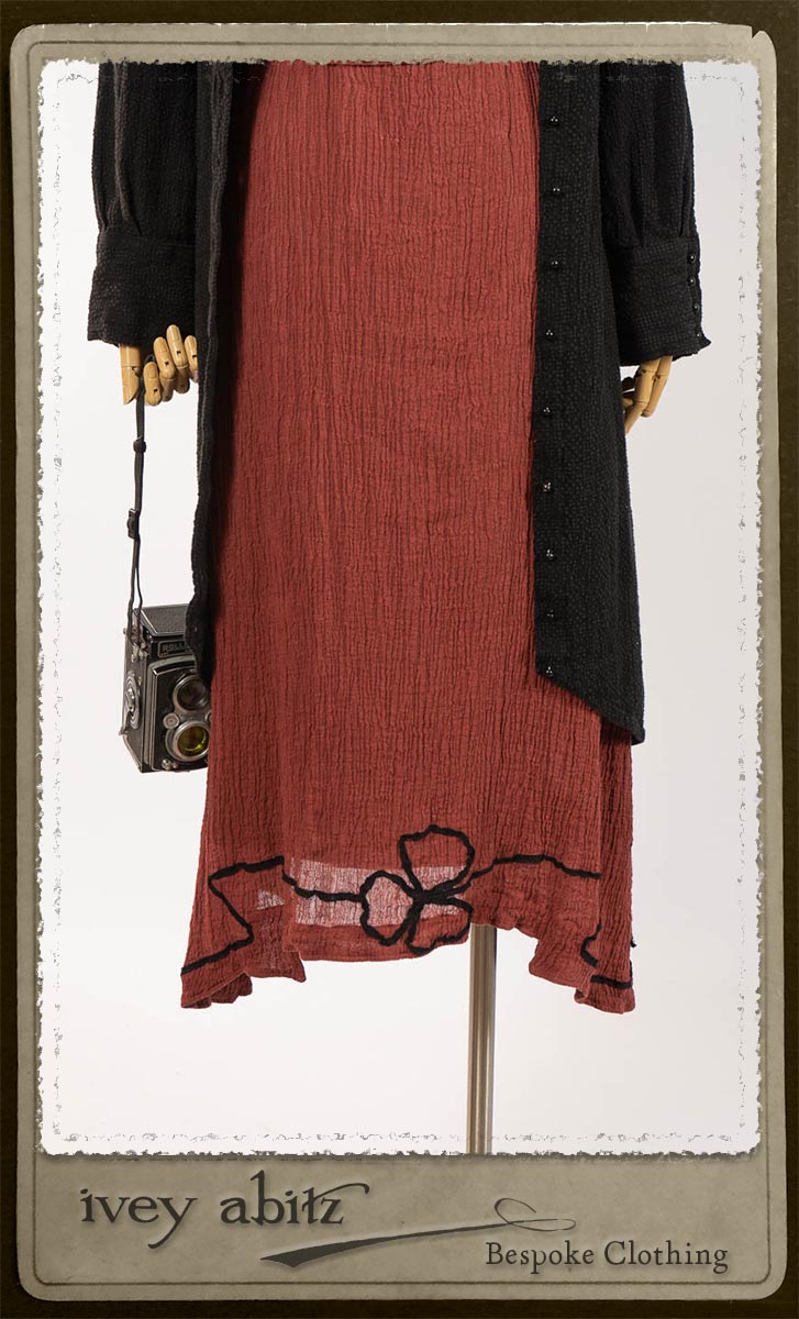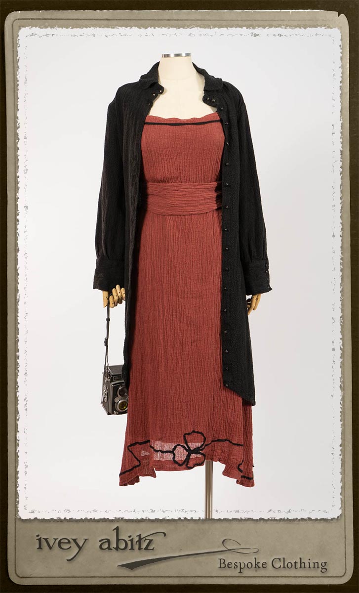 Truitt Shirt Jacket in Black Puckered Check Weave; Monceau Frock in Rosy Washed Crinkled Linen; Cilla Slip Frock in Signature Black Lightweight Linen Knit with Square Collar; Clotaire Sash in Rosy Washed Crinkled Linen. By Ivey Abitz.