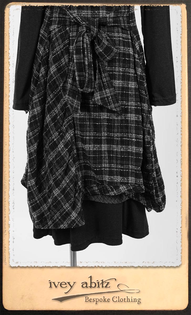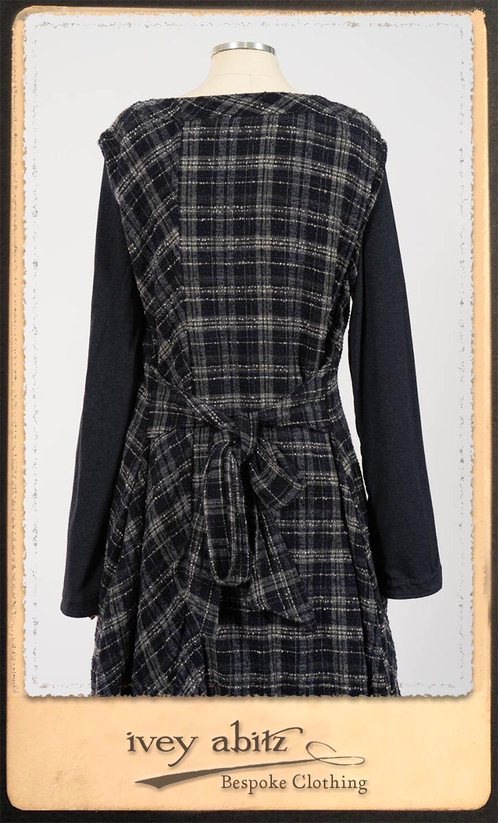 Highlands Frock in Fresh Water Wispy Plaid; Elliot Dress in Fresh Water Melange Knit; Highlands Skirt in Fresh Water Argyle Netting. By Ivey Abitz.